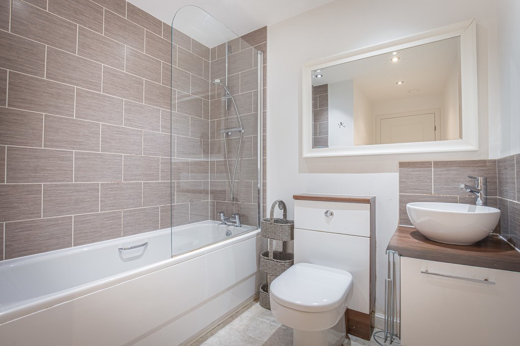 FAMILY BATHROOM The main bathroom is finished to a modern standard and comprises a panelled bath with shower attachment, WC, and wash hand basin. Neutral tiling and contemporary fittings create a clean and functional space suitable for everyday use.