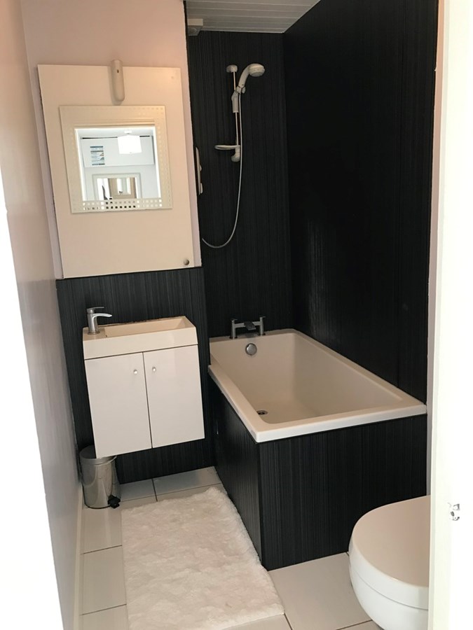 BATHROOM Modern three piece white suite with shower over bath and black decorative back splash panels.