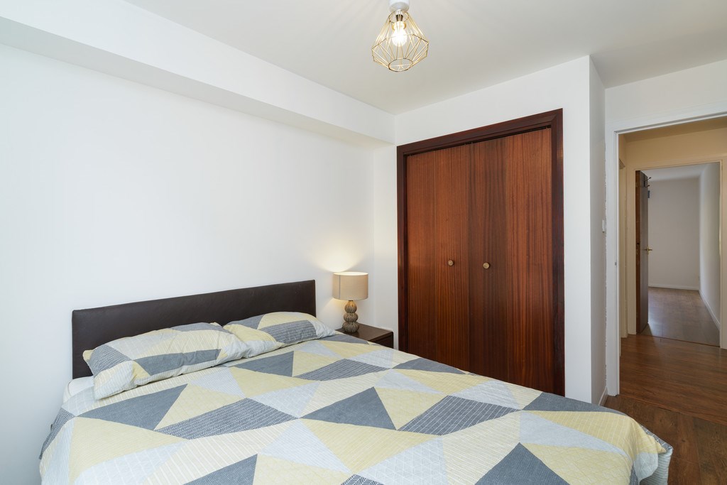 BEDROOM 1 Large double bedroom with built-in wardrobe. The room is furnished with a double bed and bedside table. Decorated in neutral tones and laminated flooring.