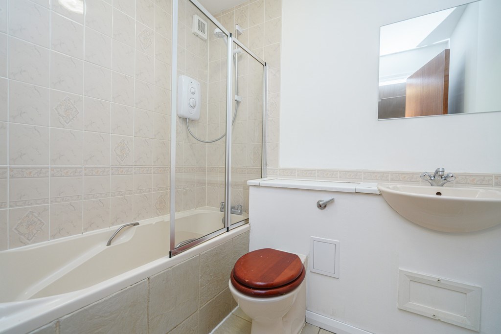 BATHROOM Traditional good-sized bathroom with electric shower over bath. Decorated in neutral tones and beige tiled flooring.