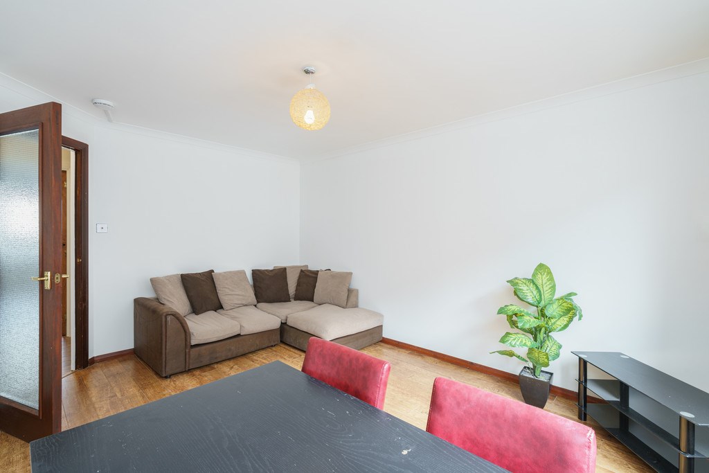LOUNGE/DINER Good-sized living area with a large L shaped fabric sofa, contemporary glass TV unit and a dining table which can accommodate up to four people. Large window provides excellent natural light. This room is decorated in neutral tones and laminated flooring.