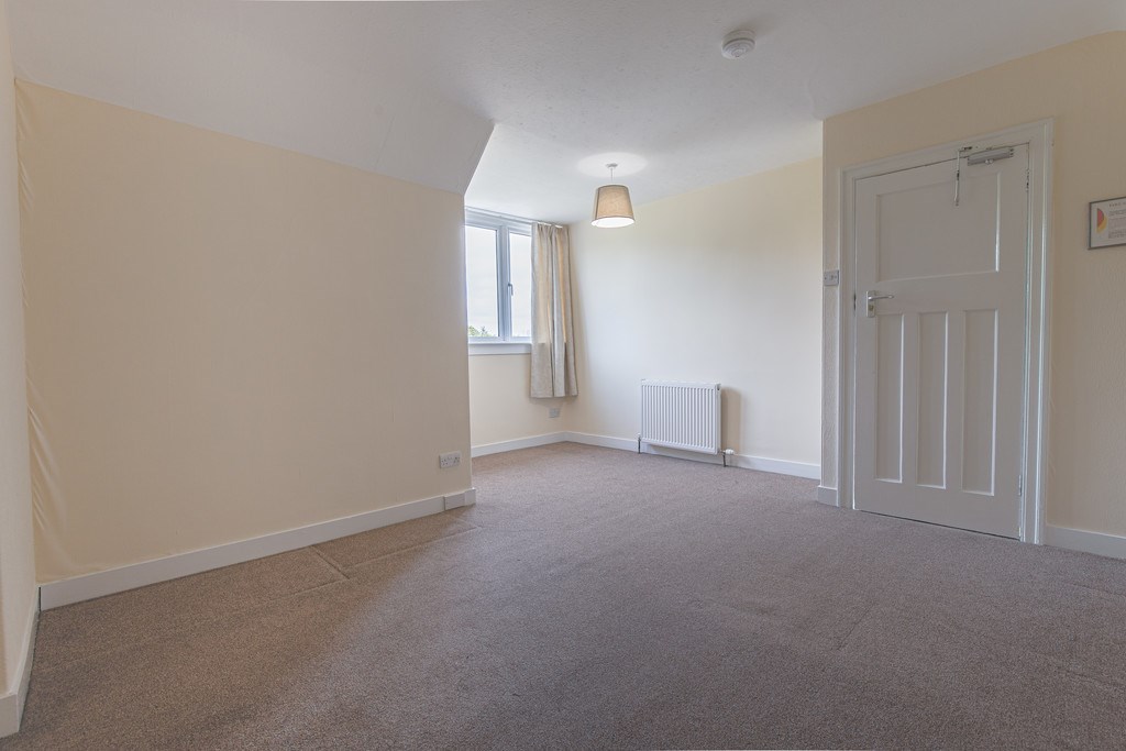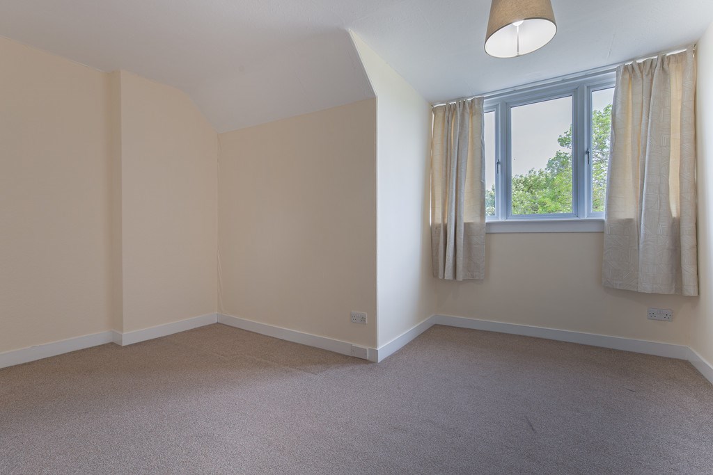 BEDROOM 3 Situated on the top floor, this bright and neatly presented third bedroom offers a peaceful retreat with leafy views through a wide front-facing window. The room is decorated in warm, neutral tones and features cosy fitted carpeting, creating a calm and comfortable atmosphere. With its slightly recessed wall and sloped ceiling detail, the space has a characterful charm while still offering ample room for a bed, desk, and storage, ideal for use as a bedroom, study, or hobby space.