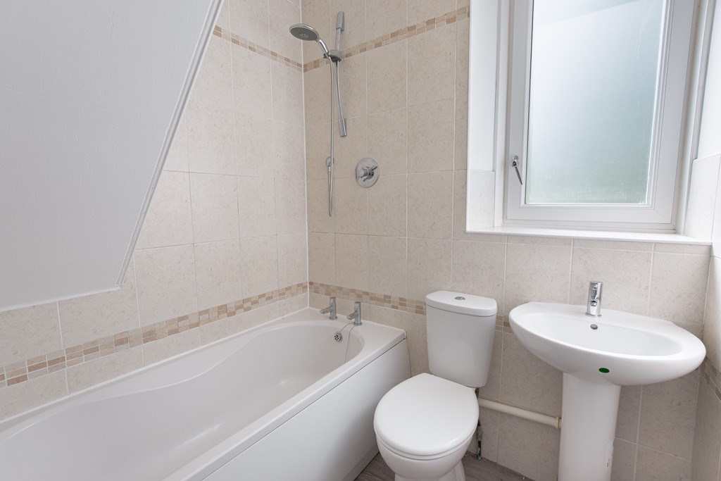 FAMILY BATHROOM The ground floor features a modern and neatly presented family bathroom, finished with neutral tiling and natural tones for a clean, timeless look. The suite comprises a full-sized bath with overhead shower, wash basin, and WC, with a frosted double-glazed window providing natural light while maintaining privacy. The space is practical and easy to maintain, ideal for everyday family use.