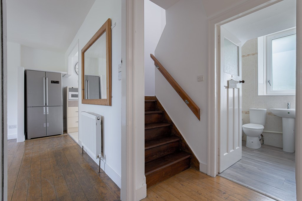 HALLWAY The property is entered via a bright and welcoming hallway with beautiful original wooden flooring and crisp white décor, creating a fresh and airy first impression. The hallway provides direct access to the main ground floor rooms and includes a radiator for warmth, wall-mounted notice board, and a glazed internal door allowing natural light to flow through from the entrance. Its clean, minimal aesthetic sets the tone for the rest of the home and enhances the sense of space throughout.