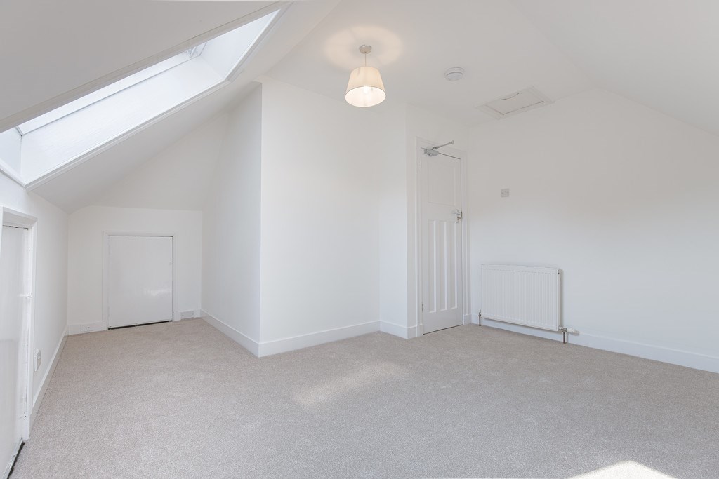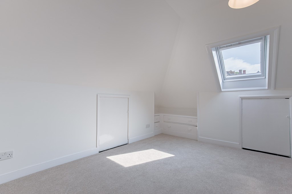 BEDROOM 4 Positioned on the top floor with a front-facing outlook, this bright and compact fourth bedroom is filled with natural light and finished in fresh white tones with soft neutral carpeting. Sloped ceilings and a recessed nook add a touch of character while maximising usable space. Ideal as a guest room, study, or children's bedroom, the room also benefits from a radiator for warmth and a built-in storage cupboard, making it a practical yet cosy space within the home.