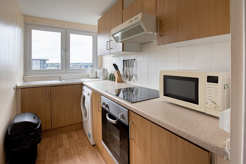 KITCHEN Lovely, large galley-style kitchen equipped with an induction hob, oven, microwave, freestanding washing machine, and fridge with freezer compartment. The kitchen enjoys fantastic views over the harbour and The Green. Stylish wooden wall and base units offer excellent storage throughout.