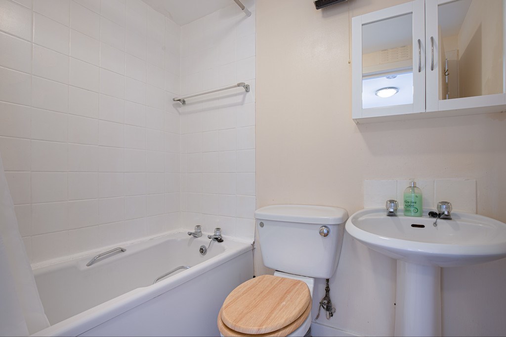 Bright and well-appointed bathroom featuring a full-size bathtub, freestanding toilet, and sink with a mirrored vanity unit. Finished with wood-effect vinyl flooring and white tiled surrounds for a clean, modern look.