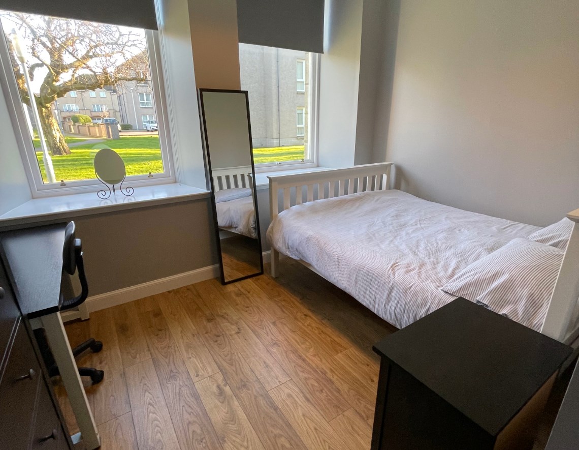 Furnished Accommodation - This ground floor fully furnished split level apartment is situated in a desirable area of Aberdeen City, within walking distance to both Union Street and the beach, and accessible to a variety of high street stores, bars, restaurants and supermarkets. There are two double bedrooms, both with built in storage cupboards and desks. The bathroom contains a large shower with plenty of storage shelves. The bright living area shares the open plan space with a fully fitted kitchen, containing a built in microwave and oven, dishwasher, washing machine, fridge and freezer. Both bedrooms and the living area look out onto the beautifully landscaped communal gardens. The flat has an allocated parking space, along with available visitor parking.