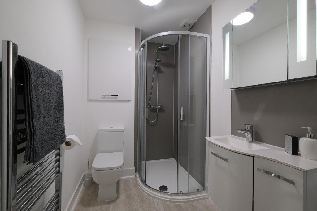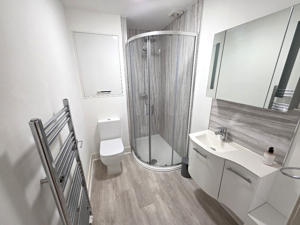 - Stylish modern bathroom with white suite and fully enclosed shower area