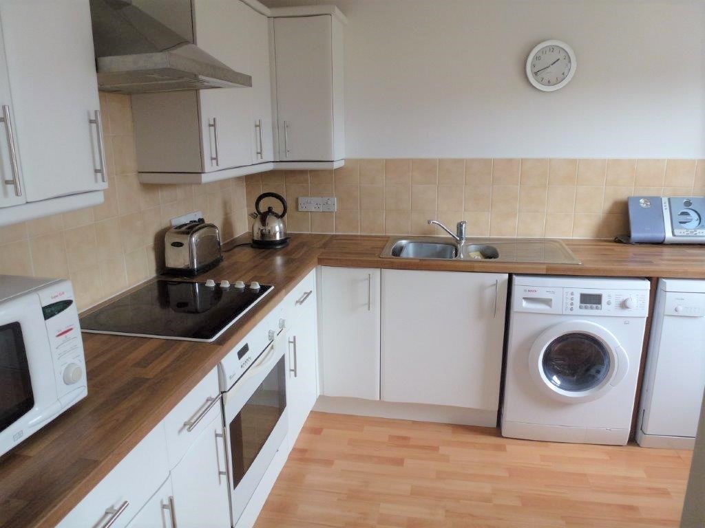 Well equipped kitchen with a range of base and wall units, complemented by co-ordinating work surfaces and splashback tiling. Electric hob with oven below and extractor above, stainless steel sink unit with mixer tap, fridge, freezer, washing machine, laminate flooring.