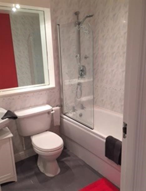 Fitted with white suite and tiled splashbacks, shower over bath, glazed shower screen, large wall mirror with two downlighters, and vinyl flooring. EPC rating: C. Landlord Registration Number: 308825/100/21211. Letting Agent Registration Number: LARN1812040.
