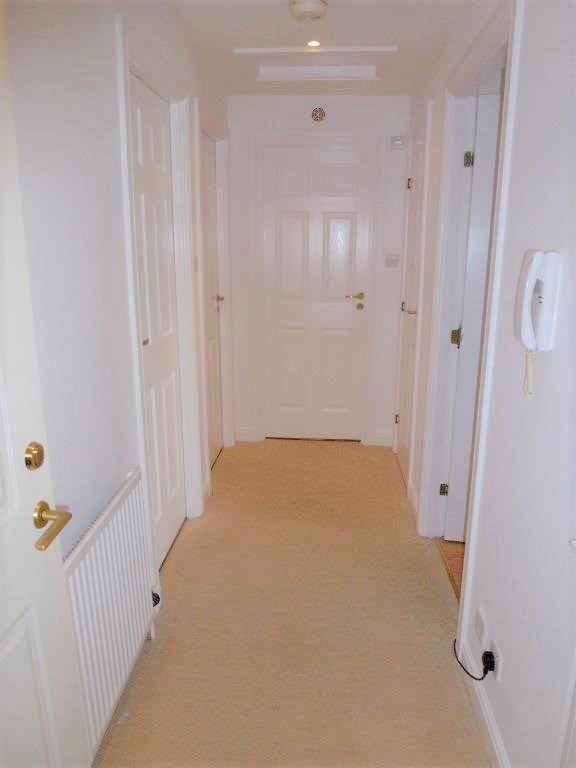 Hallway with telephone for security door locking system, meter cupboard, storage cupboard, light fitment, telephone point, fitted carpet.