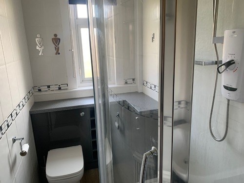 Bathroom-Electric shower in walk in cubicle, storage cupboards