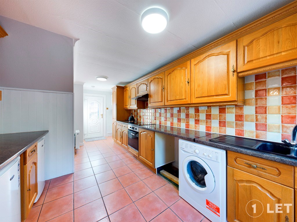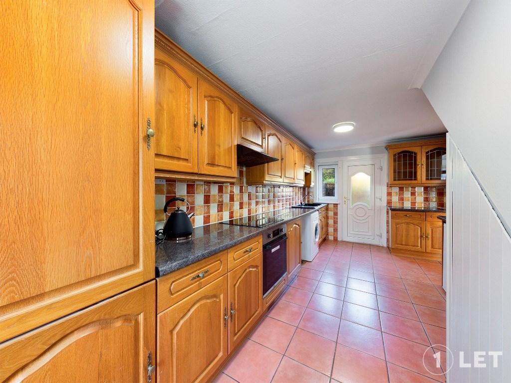 To the rear of the property lies a substantial kitchen spanning the full length of the house. With extensive fitted units and ample worktop space, it functions as an excellent family kitchen and provides direct access to the expansive rear garden, making it ideal for everyday living and hosting.