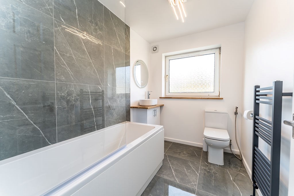 ~Contemporary bathroom suite including mains “sprinkler” shower over bath