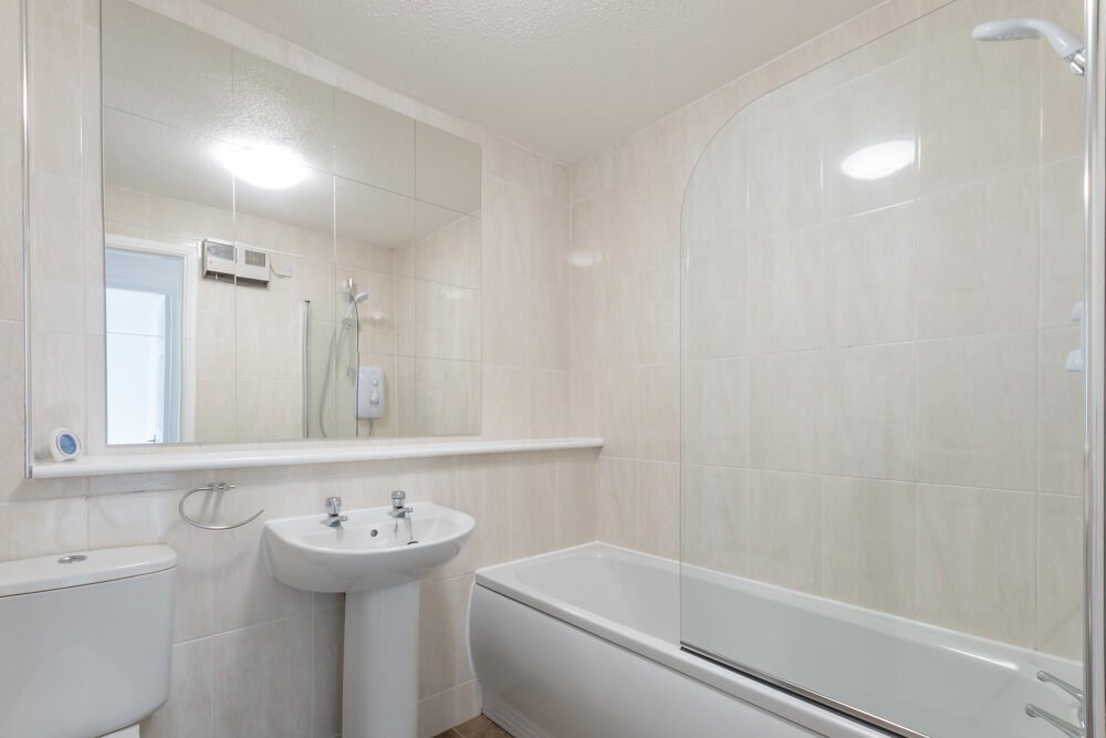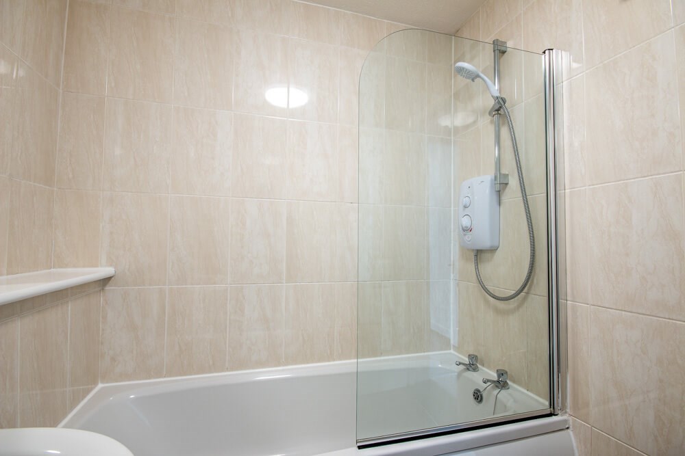 ~Stylish, tiled bathroom with electric shower over bath