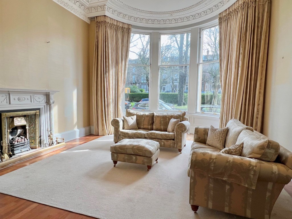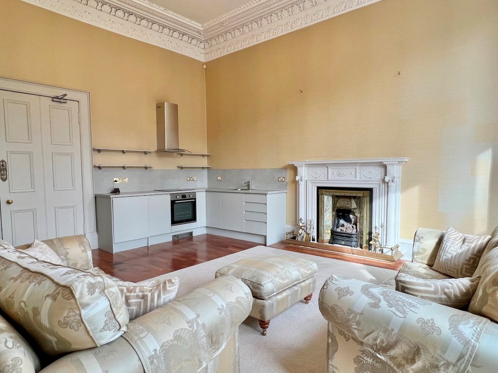 The flat is entered via a large hallway then leading to the fantastic open plan drawing room and fitted kitchen, with high ceilings with beautiful cornicing and a ceiling rose. There is a feature fireplace and a curved bay window facing south to Queensferry Road.