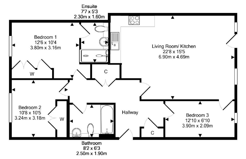 Superb three-bedroom, second floor flat in a sought after location. Presented to the market unfurnished, the property is comprised of: A large entrance hallway with storage cupboards. A bright and spacious open-plan kitchen, living and dining room with Juliette balcony. The contemporary kitchen is fitted with modern wall and floor mounted units and Siemens appliances. The master bedroom, with a large built-in wardrobe, further boasts the luxury of a high quality en-suite shower room. The second bedroom is another spacious double, with a built-in wardrobe. The third bedroom is a large single, with flexible proportions for alternative uses, such as a home office. Finally, there is an attractive family bathroom with three-piece suite. Outside, the leafy development has shared manicured gardens for summer socialising, a bike store and private residents’ parking. Further benefits include: Comprehensive double glazing throughout, gas central heating via a combination boiler and lift access.