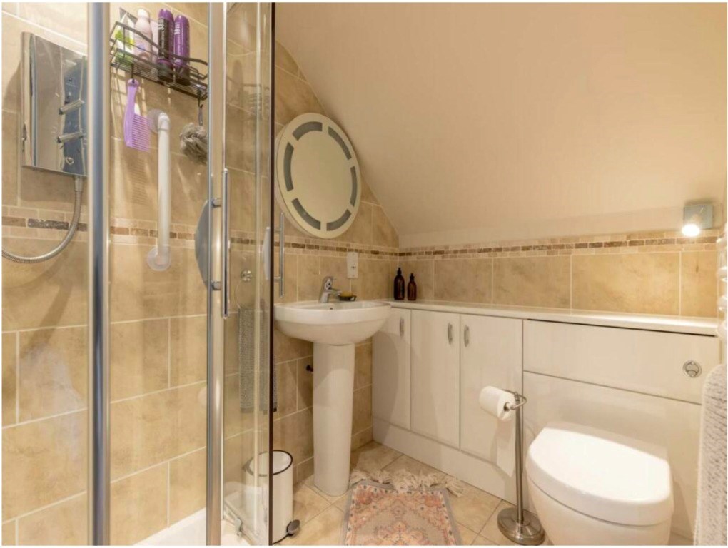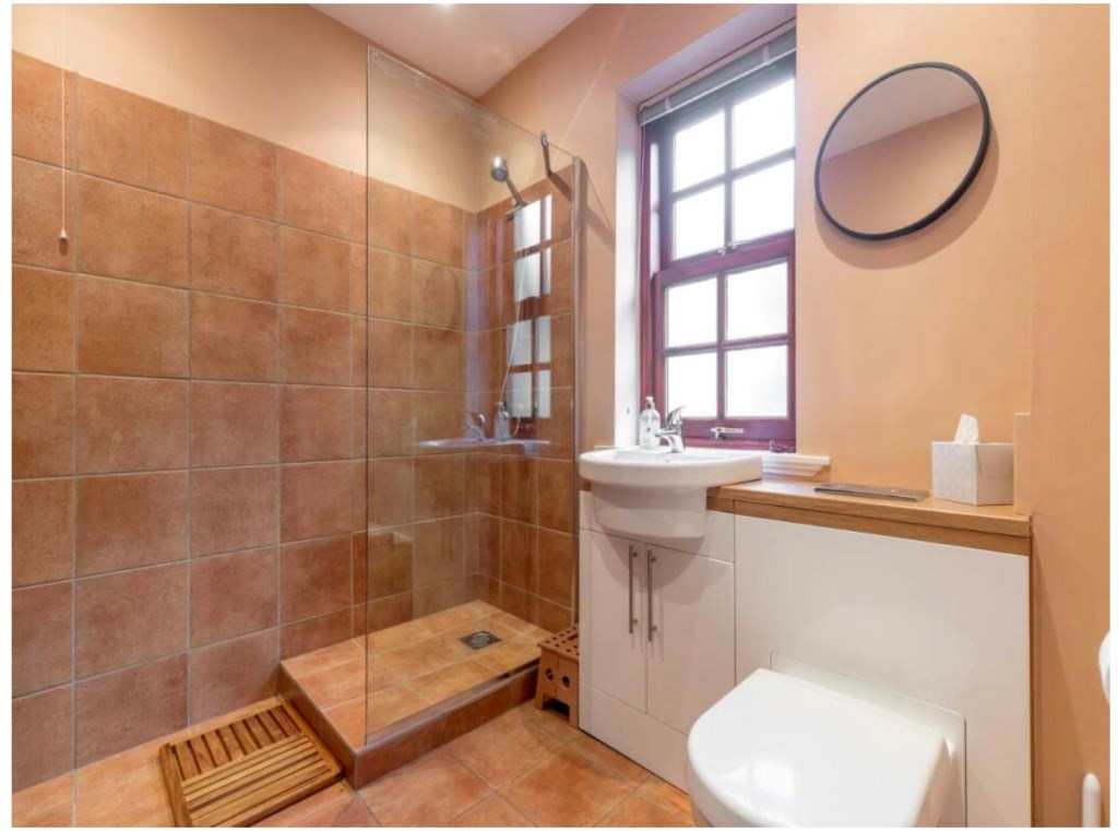 The shower room on the ground floor is tiled throughout, making it easy to clean and maintain. There is a sink with a storage unit underneath and toilet, the window in the room makes it nice and light.