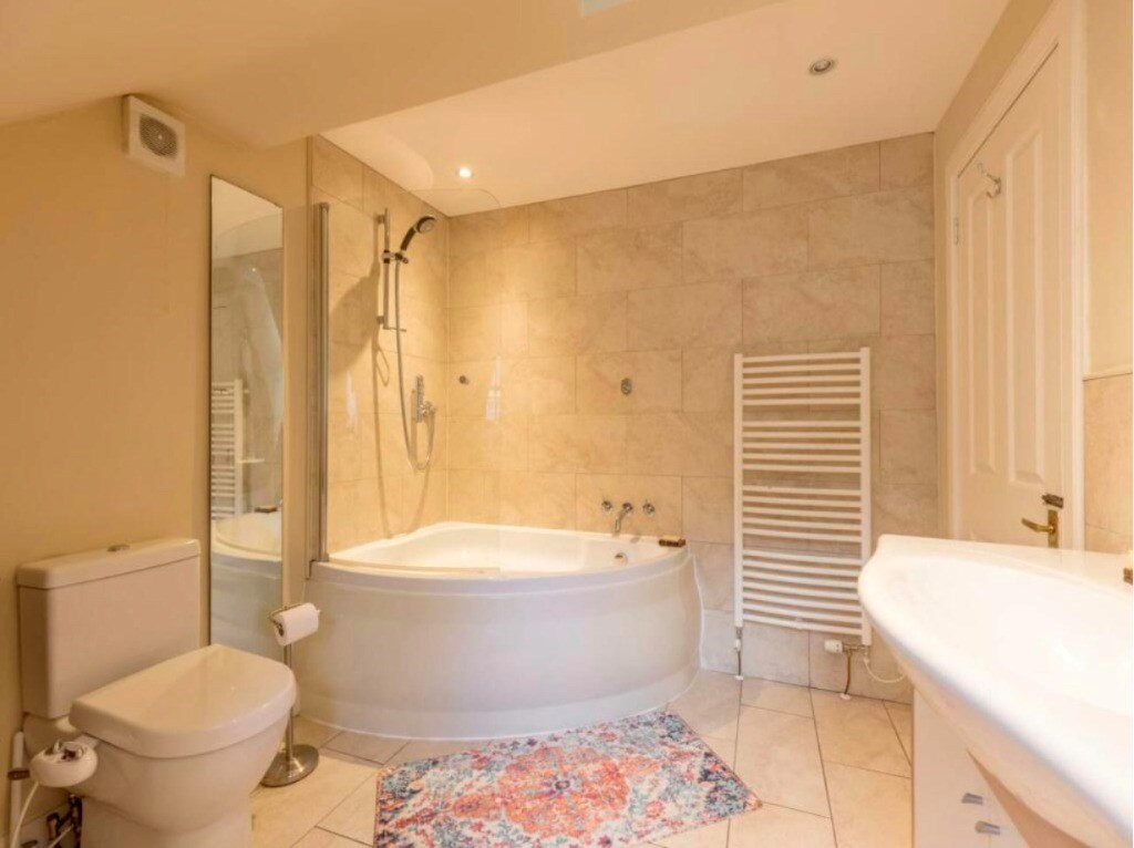 The kitchen/dining room has plenty of light coming from all each side of the property. There are windowed doors giving you direct access to the patio and front garden. There is space for a large dining room table with chairs and the two spaces are separated by different flooring. The kitchen has plenty of storage space, with cabinets above and below the worktops. The aga adds a homely feel and adding heating element within the property. The kitchen comes with a Belfast sink, full sized fridge freezer, washer/dryer, garbage diposal within the kitchen sink and clothing pulley, perfect for drying clothes.