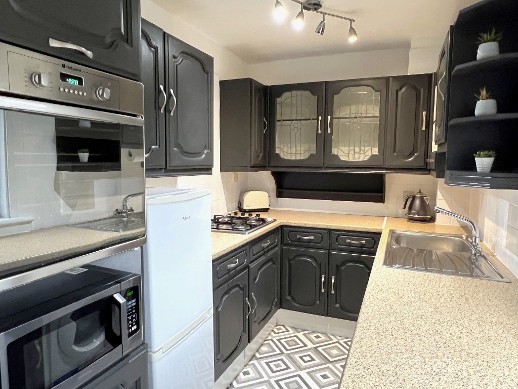 A standout feature of the property is the stylish dual aspect living room/kitchen. The living space has a decorative fireplace with a unique tiled surround, giving the room a homely feel. There is built-in alcove shelving either side of the fireplace for displaying items, as well as two, two-seater sofas. The kitchen comes fully equipped with an integrated microwave, waist-height oven, a kettle, a toaster, a gas hob, a freestanding fridge-freezer and a washing machine. It has been given a makeover with painted cabinetry and a marble-effect cover on the worktop. There is plenty of storage space with wall cabinets above and under-counter cabinets below the worktops . There is also plenty of worktop space. This large, broken-plan space, is completed by the dining area. This includes a dining table with four chairs that can be extended, making it perfect for those looking to entertain friends and family. The dual aspect of the room allows for light to come in from both the east and the west.