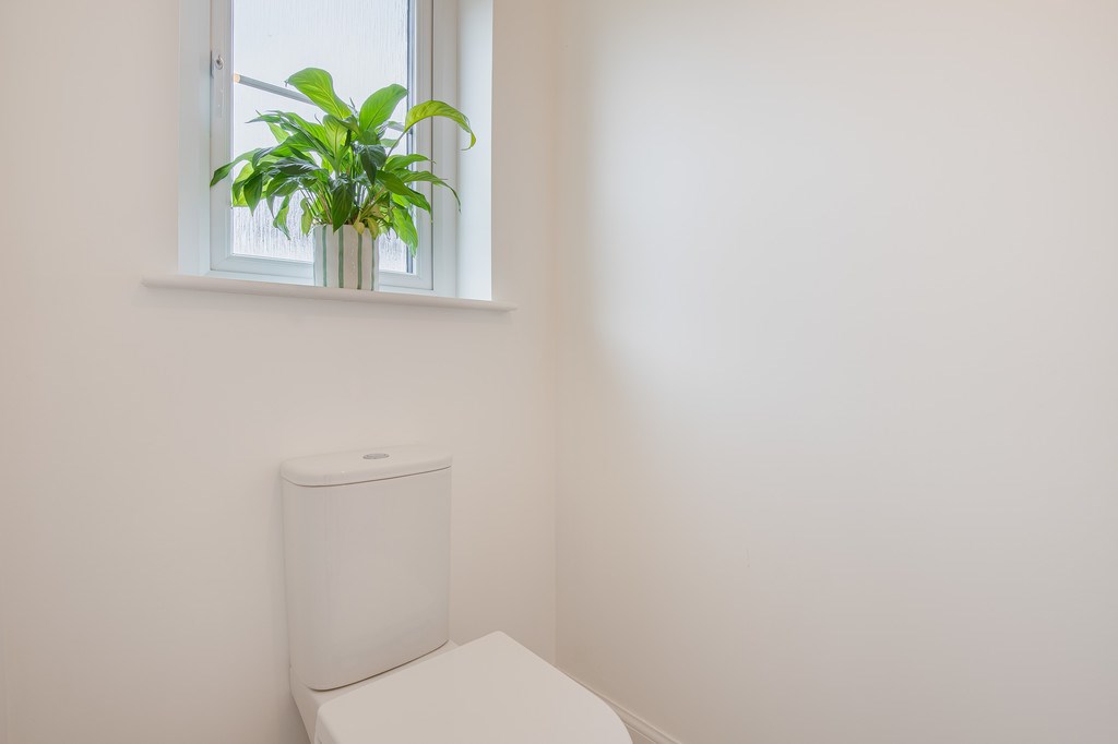 WC The WC, conveniently located just off the utility room, is a modern and practical addition to the ground floor. Finished in a crisp neutral décor, the space features a white pedestal wash basin with tiled splashback and a matching WC, complemented by a wall-mounted mirror above the sink. A frosted window allows for natural light while maintaining privacy.