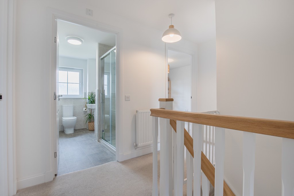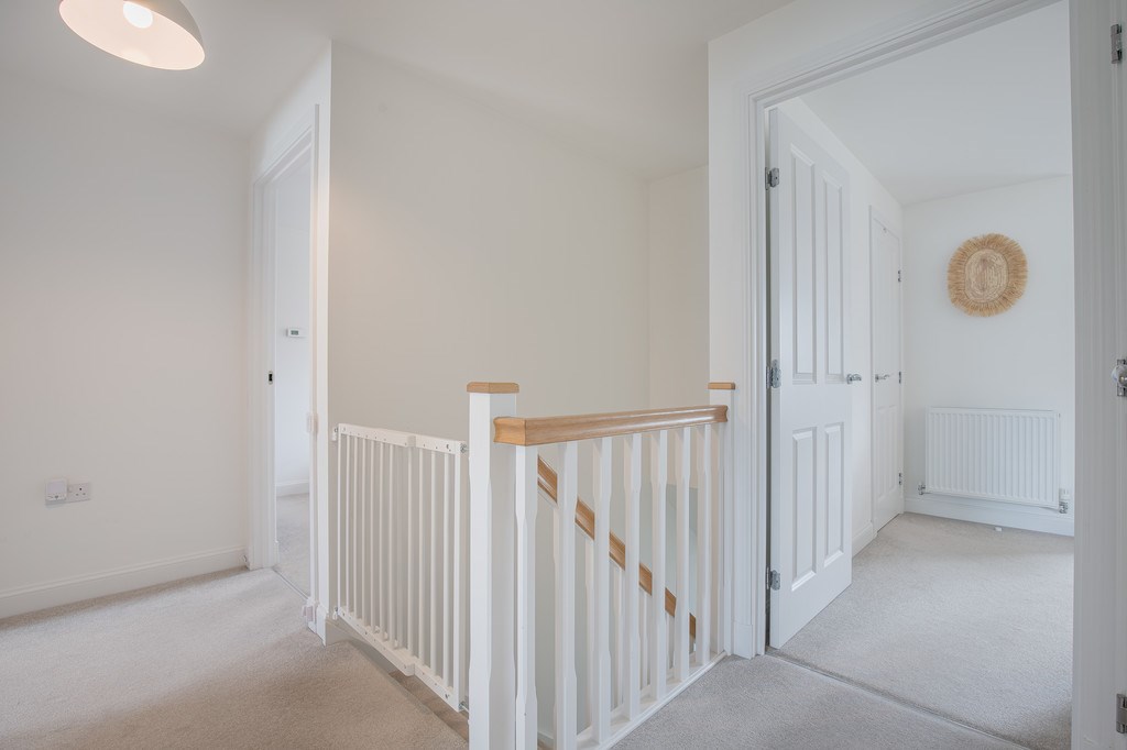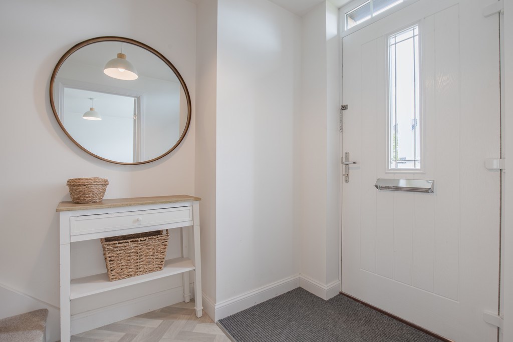 HALLWAY Upon entry, you're welcomed into a bright and spacious hallway that sets the tone for the rest of the home. The stylish herringbone-patterned flooring adds a modern touch, complementing the neutral décor throughout. To the left, a doorway leads into a cosy, carpeted lounge, while directly ahead, the hallway flows seamlessly through to the open-plan kitchen and dining area, with French doors opening onto the rear garden. A carpeted staircase with a white balustrade and natural wood handrail rises to the upper floor, creating a warm and inviting entrance. Pendant lighting and clean lines complete this elegant and practical entryway. A generous under-stairs cupboard offers excellent storage.