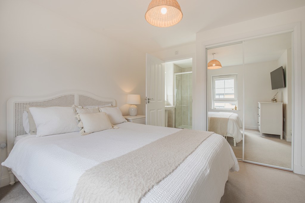 1ST FLOOR BEDROOM 1 (MASTER) The master bedroom is a beautifully presented, generously proportioned retreat, finished in calm, neutral décor for a light and relaxing feel. A large window floods the room with natural light, while soft carpeting adds warmth and comfort. Tastefully furnished with a king-size bed and matching bedside tables and lamps, it offers a stylish yet cosy setting. A full walk-in wardrobe with fitted shelving and hanging space provides excellent storage and enhances the sense of space. The master also benefits from a modern en-suite shower room, featuring a walk-in shower with tiled surround, WC, wash basin and a heated towel rail.