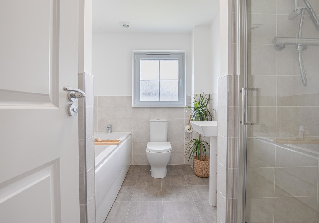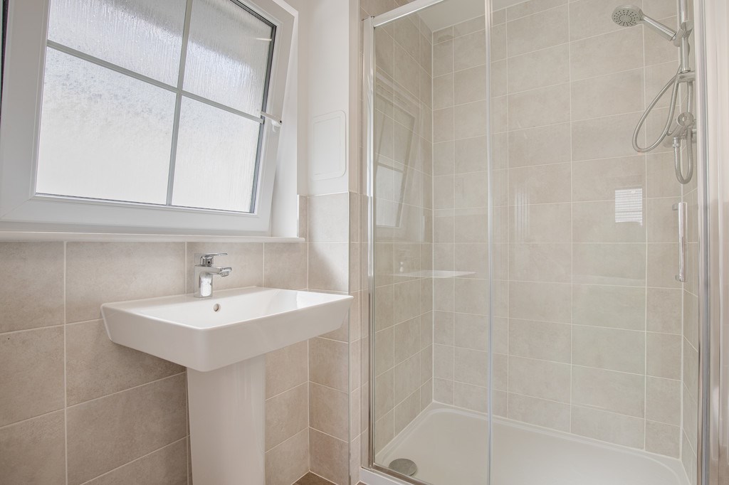 FAMILY BATHROOM The family bathroom is a bright and contemporary space, finished in neutral tones with modern tiling that creates a clean and calming atmosphere. It features a white three-piece suite, including a WC, pedestal wash basin, and a bath with mixer tap, complete with a tiled splashback for a sleek finish. A separate shower enclosure with a glass door and chrome fittings offers added convenience for busy households.