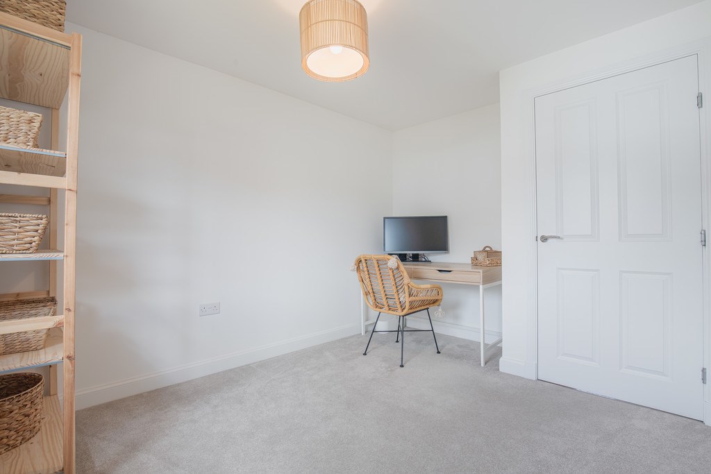 BEDROOM 4 The third bedroom is a well-proportioned and versatile space, finished in fresh neutral tones with soft carpeting that enhances its light and airy feel. A good-sized window allows plenty of natural light to brighten the room, making it an inviting and adaptable area. Currently styled as a home office, the room is equally suitable as a comfortable bedroom, nursery, or guest room. With ample floor space and scope for freestanding furniture, it offers flexibility to meet the needs of modern family living.