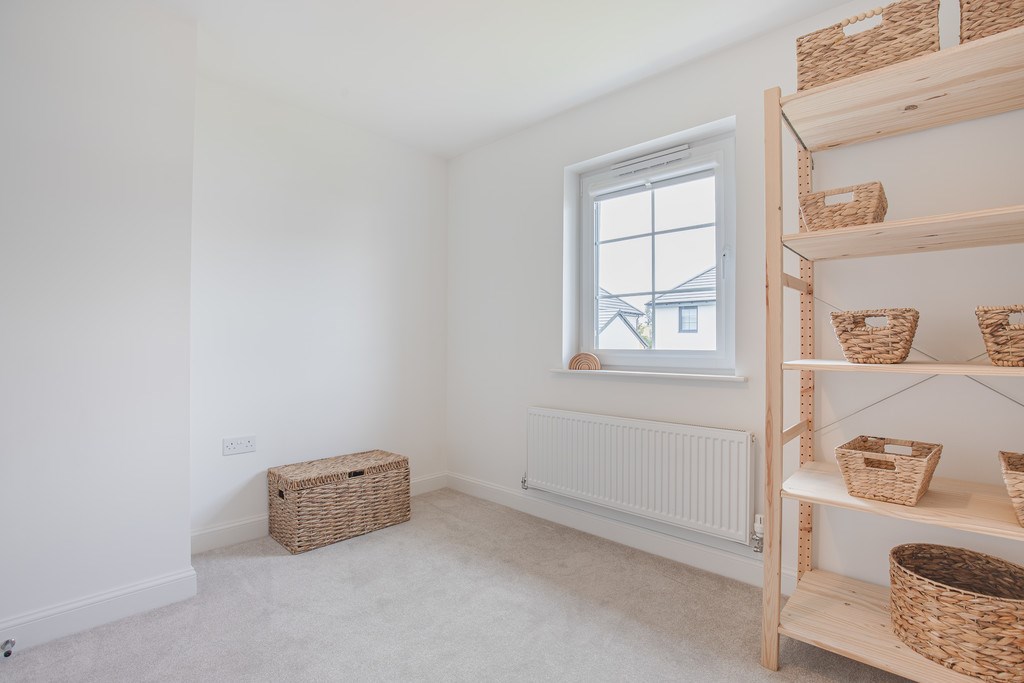 BEDROOM 2 The second bedroom is a bright and versatile space, finished in neutral tones with soft carpeting underfoot. Its clean and minimal design provides a blank canvas, ready to be styled to suit individual needs, whether as a child's bedroom, guest room, or home office. A good-sized window allows natural light to fill the room, creating a welcoming and airy feel. With ample floor space and potential for wardrobes or additional furnishings, this room offers excellent flexibility for modern family living.