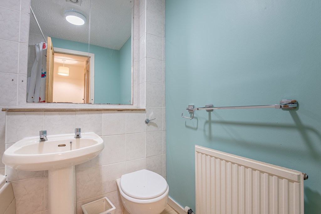 BATHROOM Compact and functional bathroom with a pedestal sink, toilet, and a large wall-mounted mirror. Light blue walls and tiled surrounds create a clean, airy atmosphere.