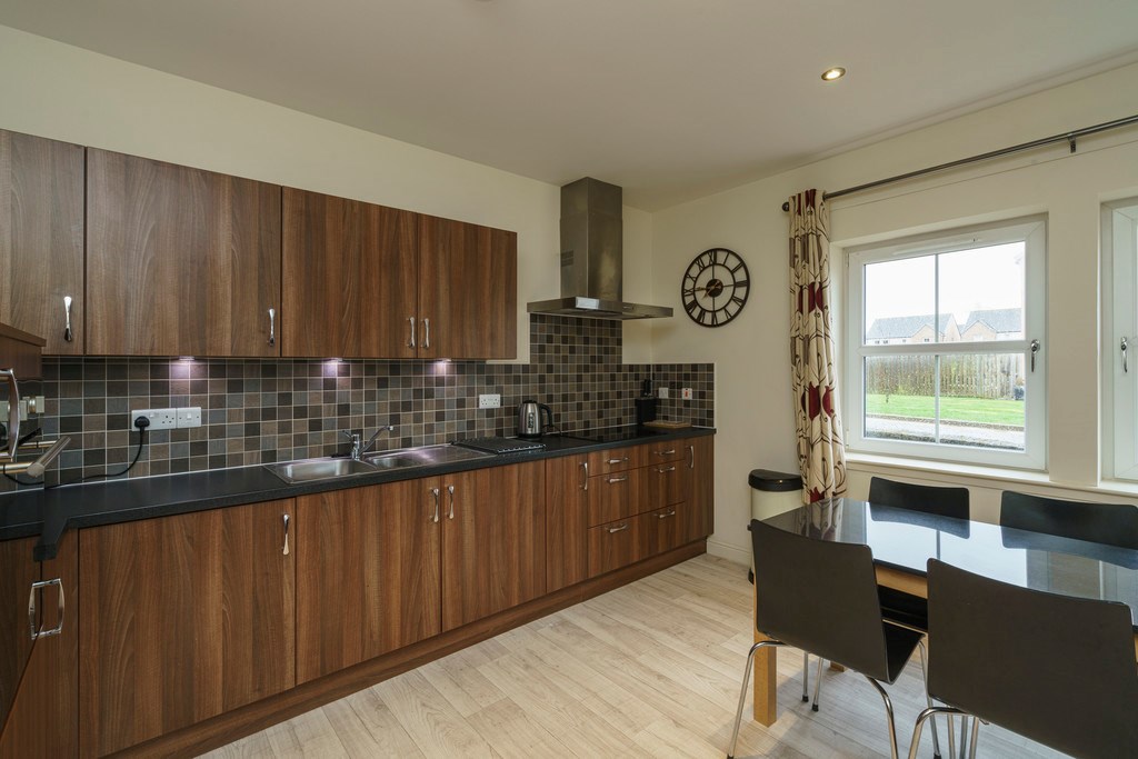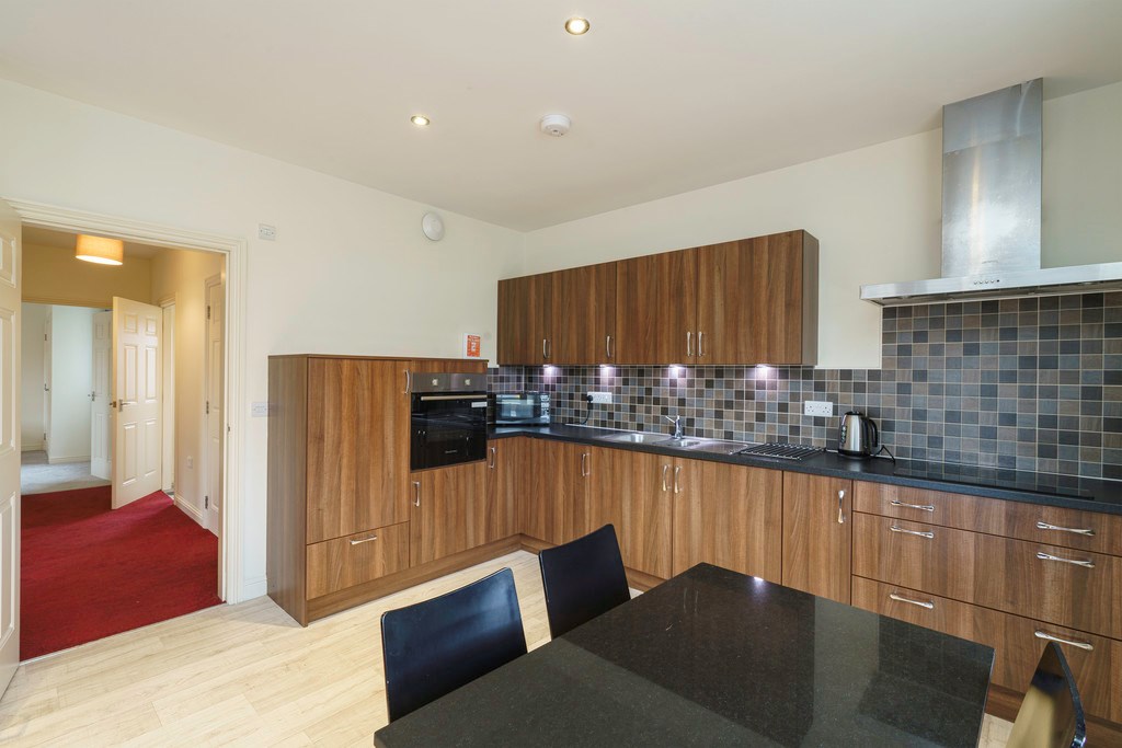 LOUNGE/KITCHEN/DINER Generous open plan living and dining area with two leather sofas, TV unit, and a glass coffee table. This room also benefits from a dining table which can easily accommodate up to four people. Large windows providing excellent natural light. The extensive modern kitchen comes with a range of appliances including a ceramic electric hob/oven along with an integrated fridge/freezer. Dark wooden units and black counter tops complete this sleek kitchen.