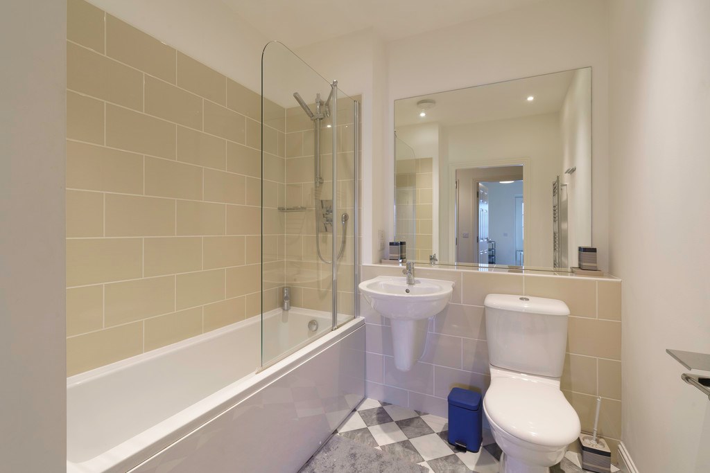 BATHROOM Modern bathroom which has had no expense spared. There is a white three-piece suite with a shower over bath with beige tiled surround. The bathroom benefits from a heated towel rail and large mirror.