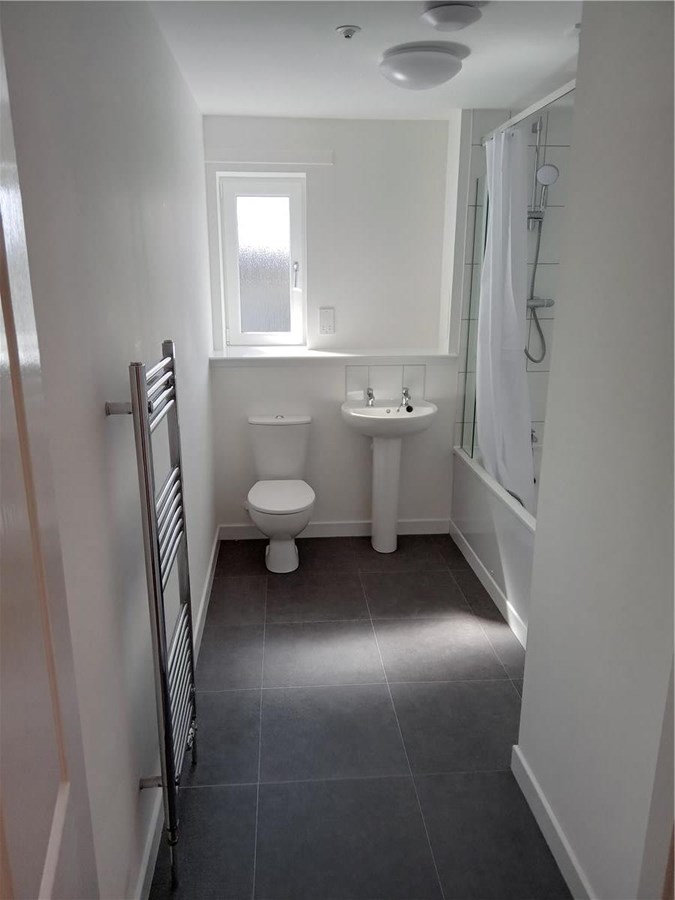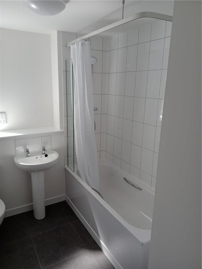 1 bedroom contemporary style property offering quiet residential living. Built in partnership with bespoke developers Culross, this stylish flat is well designed with simple white decor throughout, contemporary grey carpets in the common areas and grey vinyl in kitchen and bathroom. Open plan lounge/kitchen, hallway with storage, double bedroom and bathroom with shower over bath. Thermostatic shower in bathroom offering optimal water pressure. Double Glazing. Gas Central Heating.