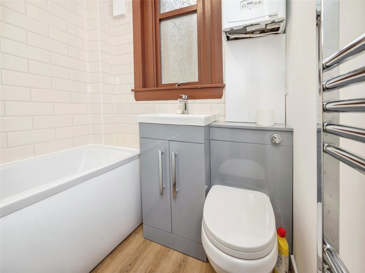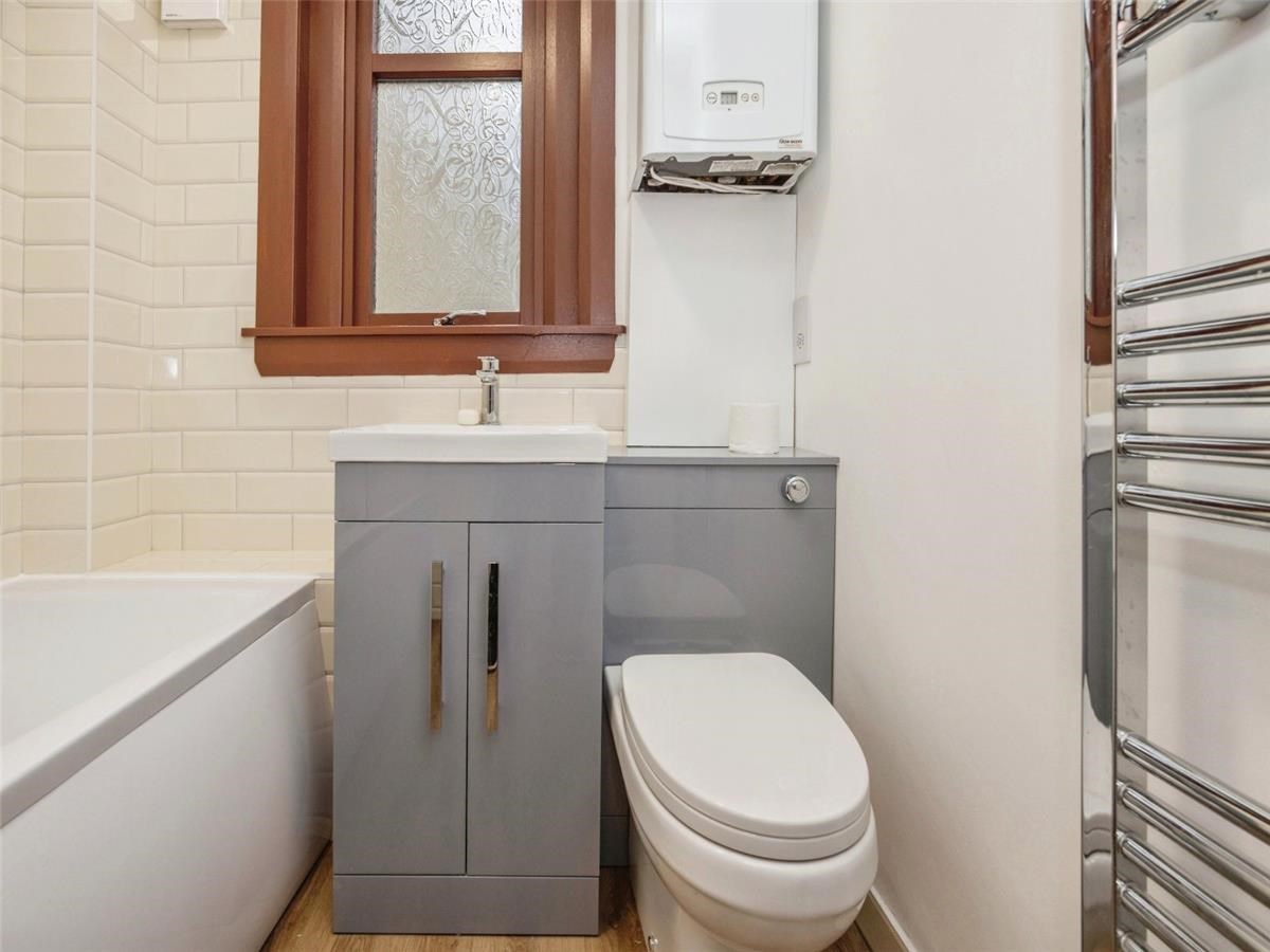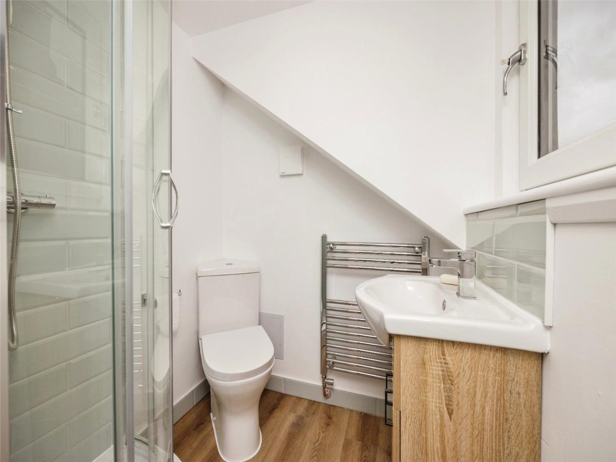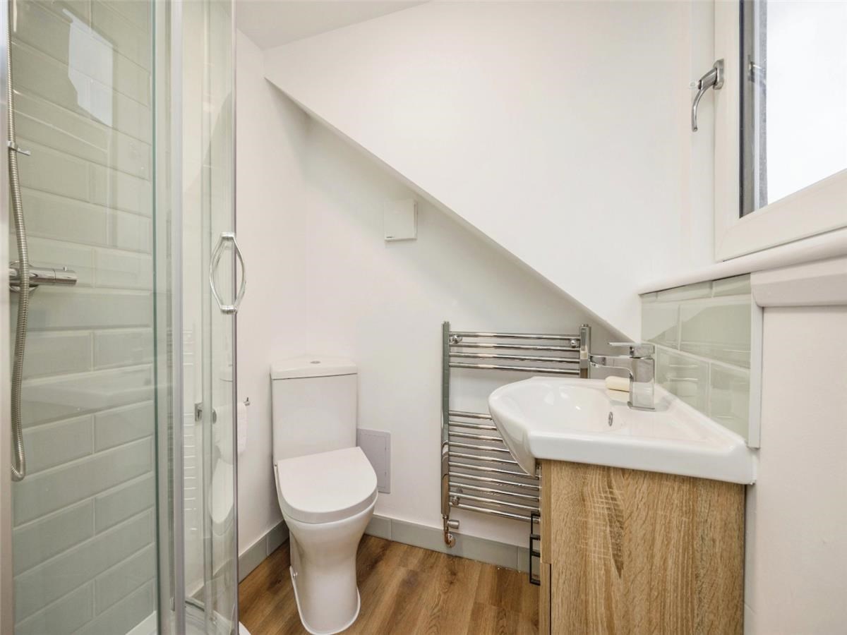 The top floor is dedicated to the master bedroom, complete with dormer window to the rear and twin Velux windows to the front. A private en-suite toilet includes a vanity sink unit, WC, and chrome heated towel rail.