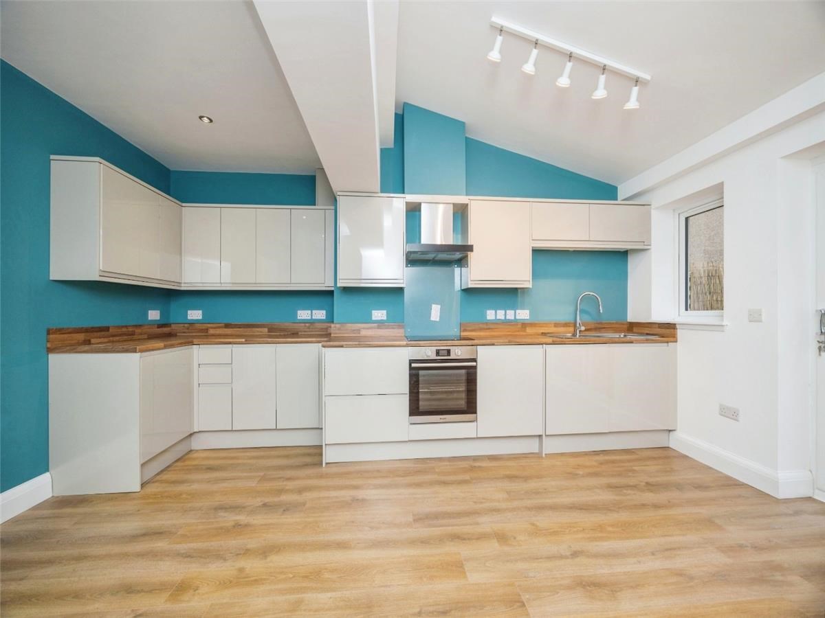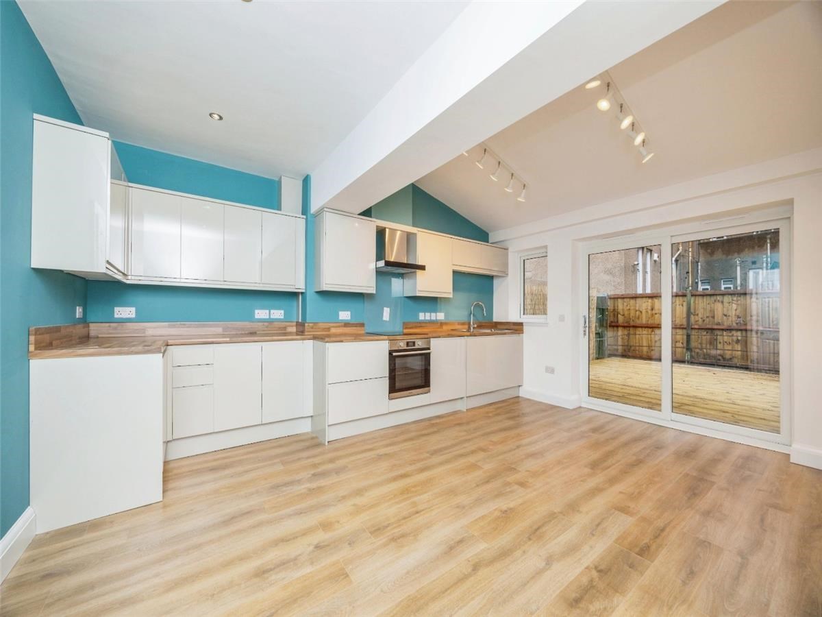 Upon entering, a bright hallway leads to the main living areas and staircase to the upper floors. The spacious front reception room, enhanced by a bay recess window, is flooded with natural light and benefits from a large storage cupboard. To the rear, the expansive open-plan kitchen and dining room is a true highlight. Featuring sleek high-gloss units, wooden worktops, and integrated appliances, it provides an ideal space for both everyday living and entertaining. Sliding patio doors open directly onto the south-facing decked garden, perfect for outdoor dining and relaxation.