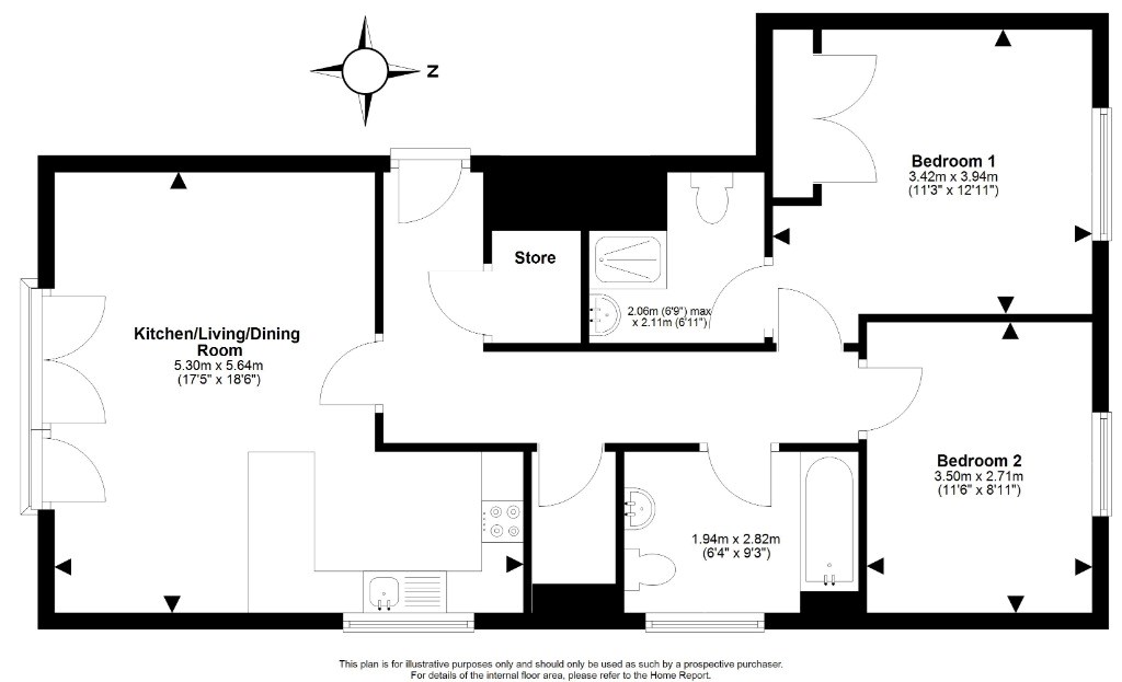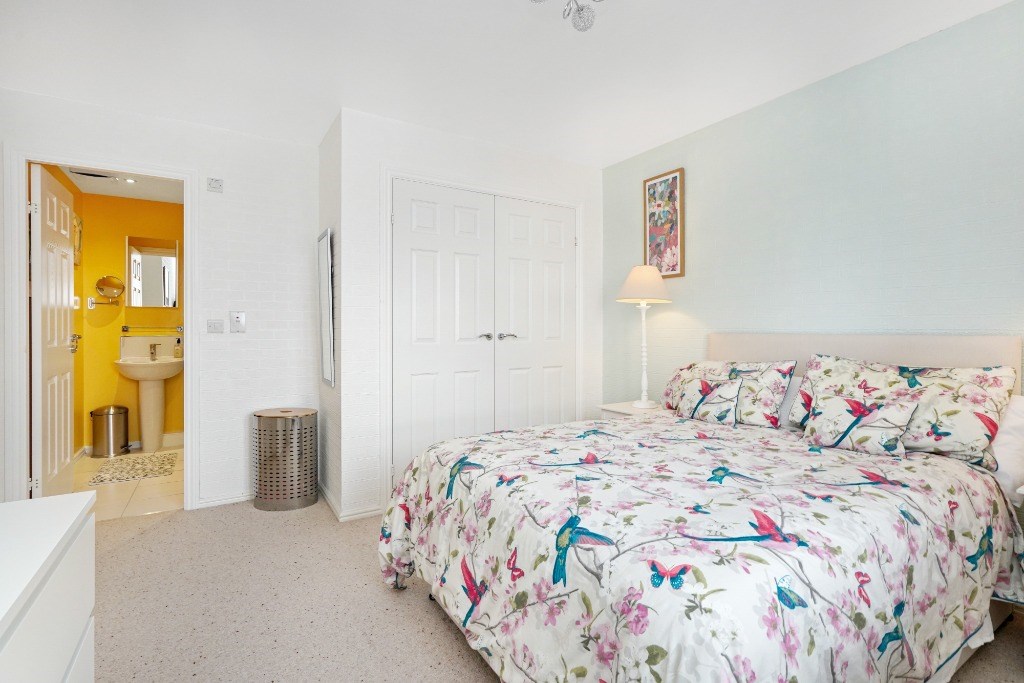 The property comprises a generous living room with breakfast bar dining area along with a charming Juliet balcony, alongside a well-equipped kitchen. There are two comfortable double bedrooms, including a principal bedroom with built-in wardrobe space and a modern ensuite shower room with a sleek shower cubicle. A second contemporary bathroom is fitted with a full-sized bath and shower over.