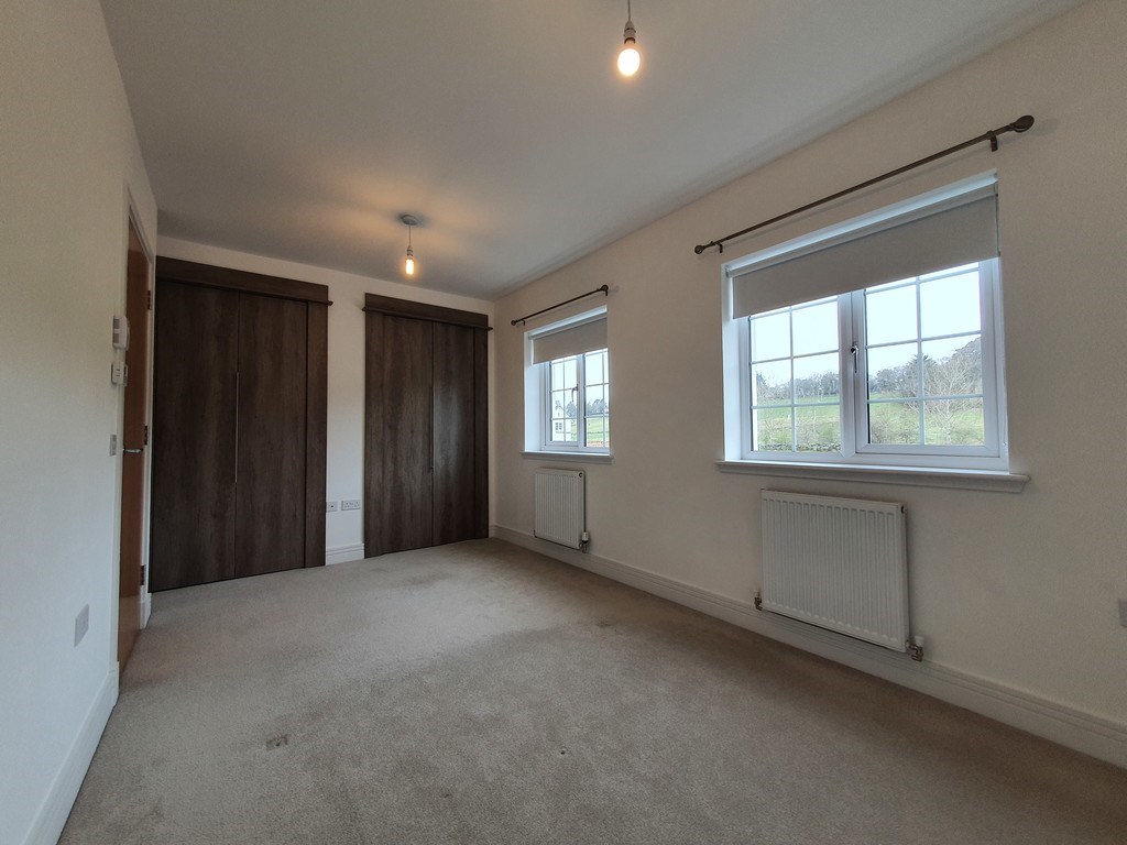 UPSTAIRS Impressive master bedroom that has been neutrally decorated with cream walls and carpets. It is furnished to a very high standard with built in cupboards that span the entire length of the back wall. Large windows allow natural light to stream through.