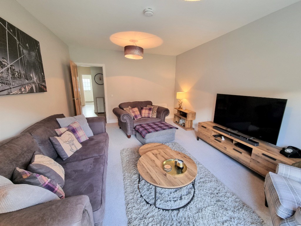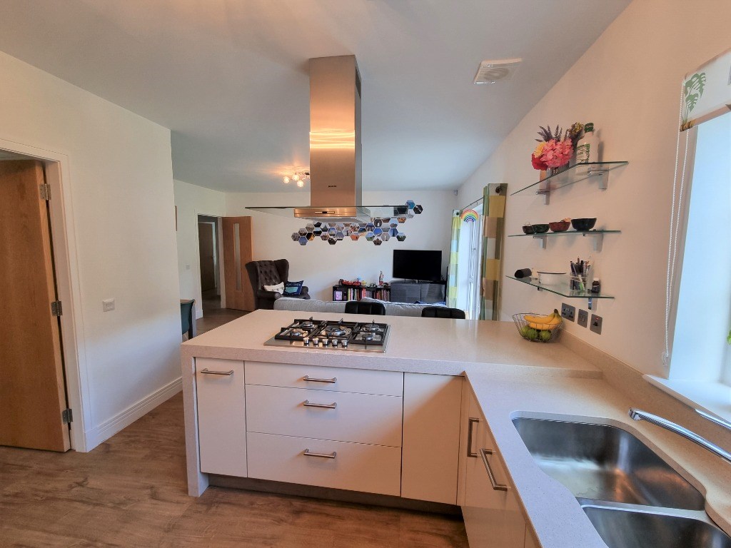 The downstairs comprises; entrance vestibule leading into entrance hallway with under stair storage; open plan lounge/living room with dishwasher, gas hob with 5 burners and patio doors to the back garden; utility room with washing machine and tumble dryer, leading out to the garden and through into the garage; separate lounge with patio doors leading out to the garden; dining room and WC.