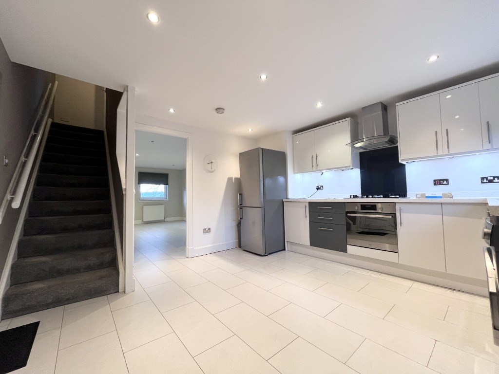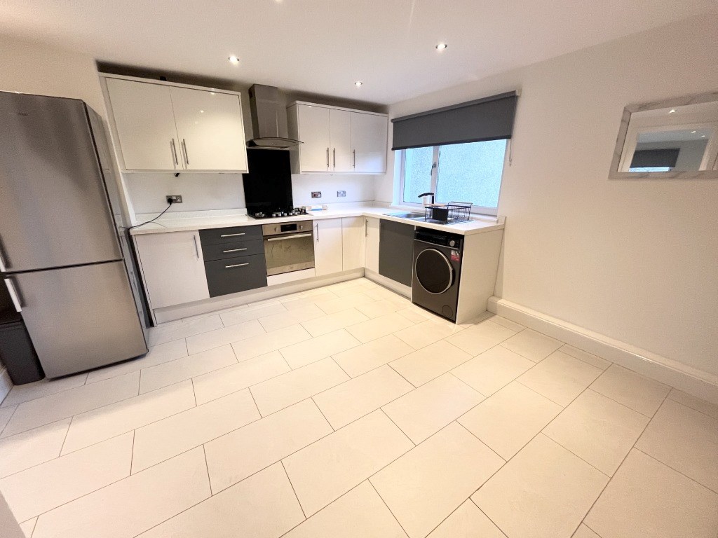 Contemporary open-plan kitchen/dining area with sleek two-tone shaker units, granite effect worktops, floor tiles, and integrated appliances (gas hob, oven, fridge/freezer, washing machine – all included!)