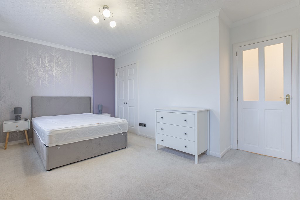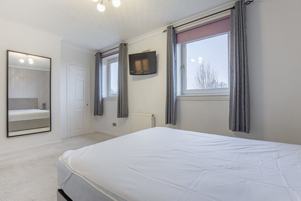 BEDROOM 1 The master bedroom for this property boasts a spacious layout and features two large street facing windows that spill plenty of light into the room. With a wall mounted television, chest of drawers, two large storage cupboards, comfortable double bed and body length mirror, the bedroom gives off a cosy and sophisticated vibe.