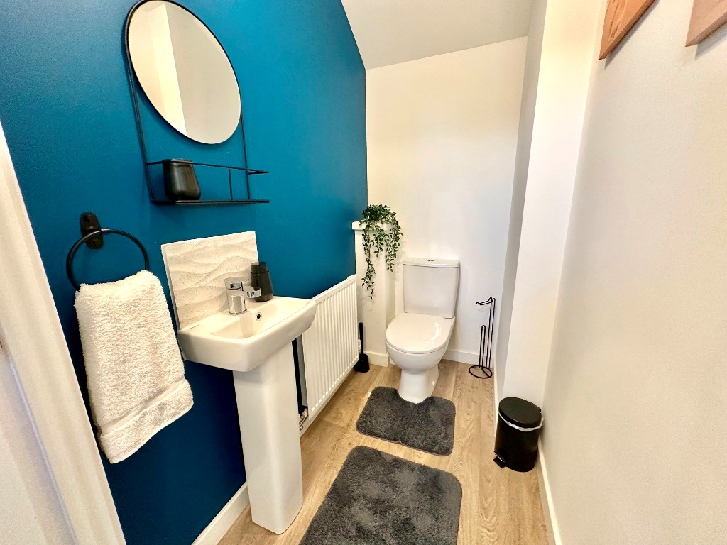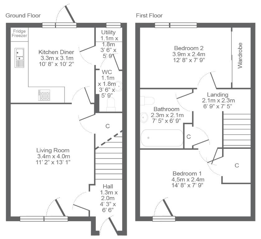 Internally the property is entered into on the ground floor level via the hallway which leads through to the living room as well as to the first floor via the staircase. The front-facing lounge has the addition of a handy under-stair cupboard and leads into the rear facing dining kitchen. The kitchen is tastefully designed and features a range of base and wall-mounted units and comes complete with integrated appliances including fridge freezer, dishwasher, electric oven and ceramic hob. Just off the kitchen are a convenient utility room housing the washing machine and a W.C.