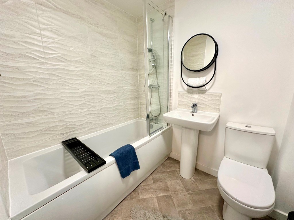 Upstairs there is a handy storage cupboard on the landing, two double sized bedrooms, both with storage and a well-appointed three-piece bathroom with modern white three piece bathroom suite and a mains powered shower over the bath.