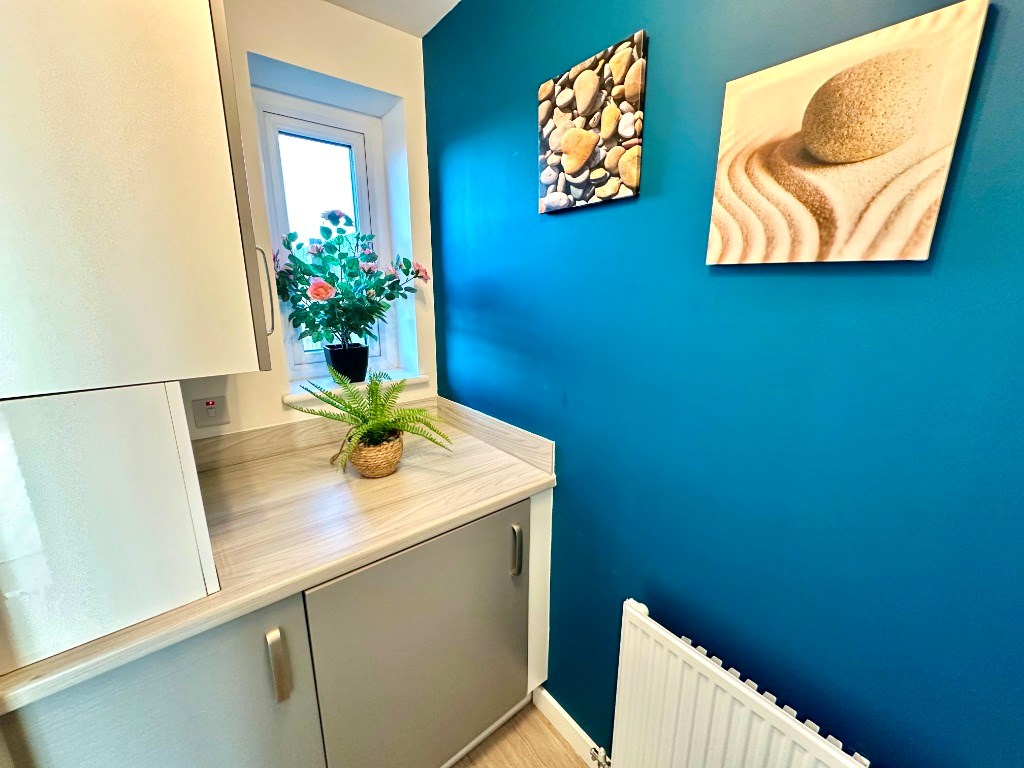 Internally the property is entered into on the ground floor level via the hallway which leads through to the living room as well as to the first floor via the staircase. The front-facing lounge has the addition of a handy under-stair cupboard and leads into the rear facing dining kitchen. The kitchen is tastefully designed and features a range of base and wall-mounted units and comes complete with integrated appliances including fridge freezer, dishwasher, electric oven and ceramic hob. Just off the kitchen are a convenient utility room housing the washing machine and a W.C.