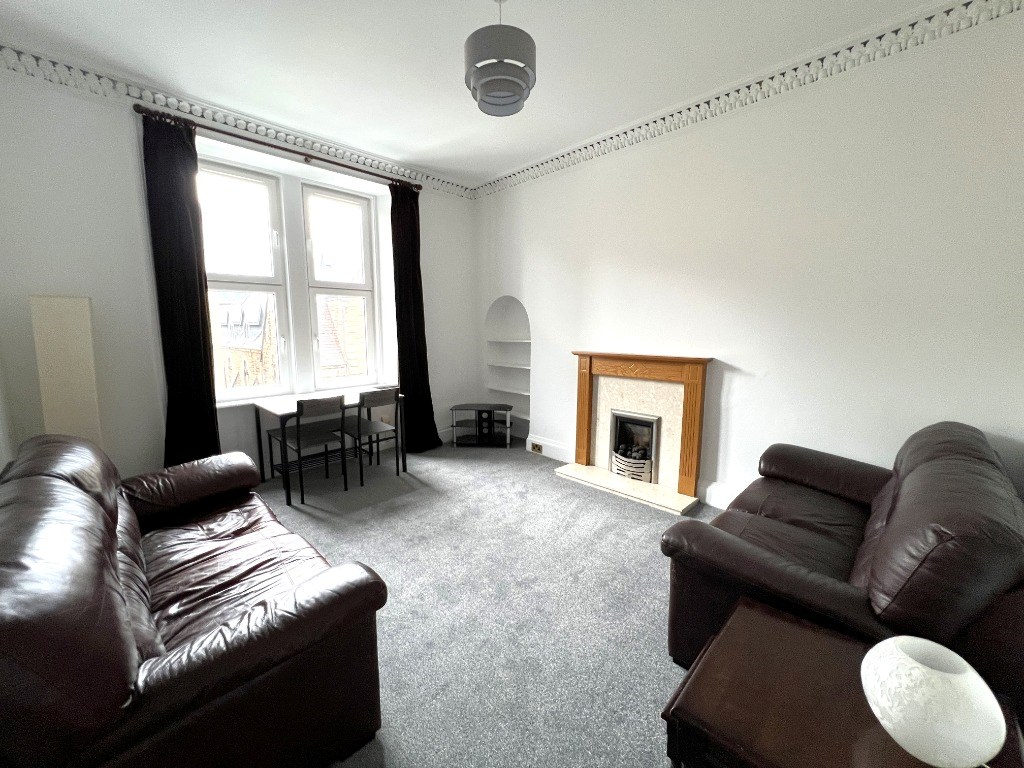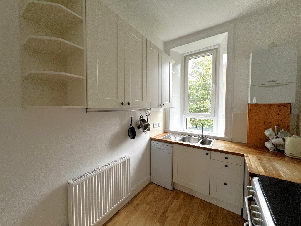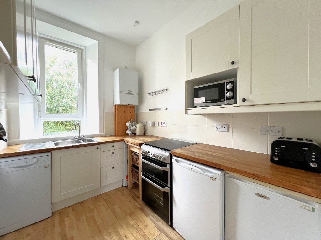 The living room is dominated by the large window, which really gives the room a feeling of space. This room has a fresh and modern look, with traditional features such as the Edinburgh press adding charm. There is a gas fire as a focal point and a dining table has also been provided.
