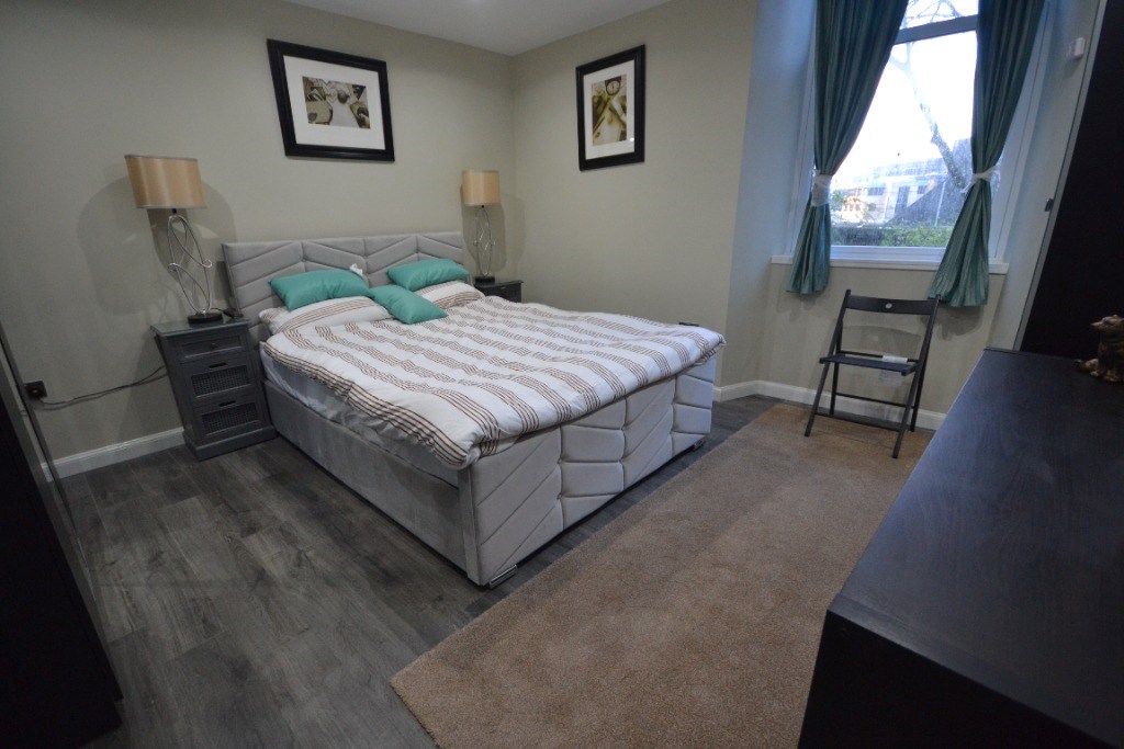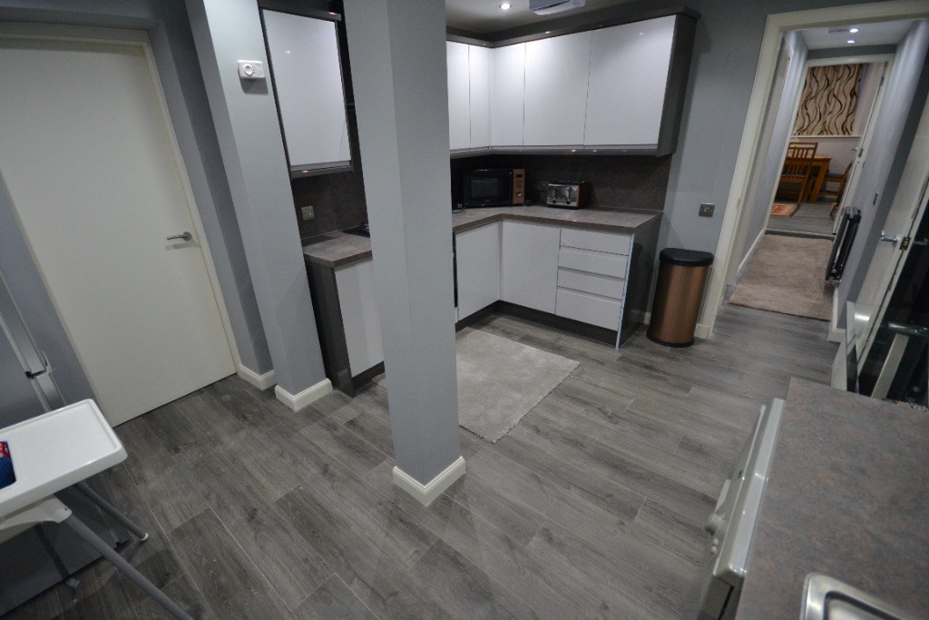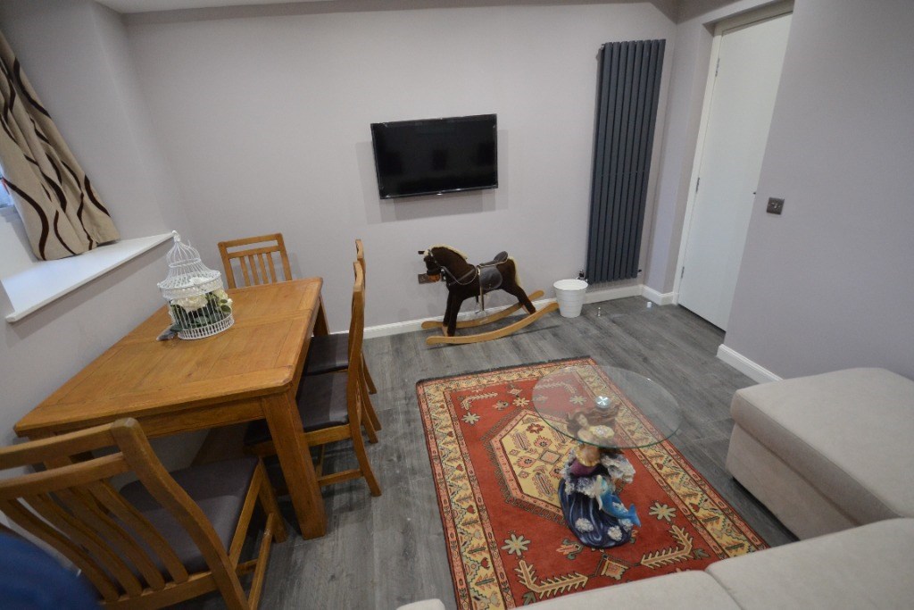 The property comprises entrance hallway, large double bedroom, sitting room, large kitchen, shower room, washing machine room, and large storage cupboard.