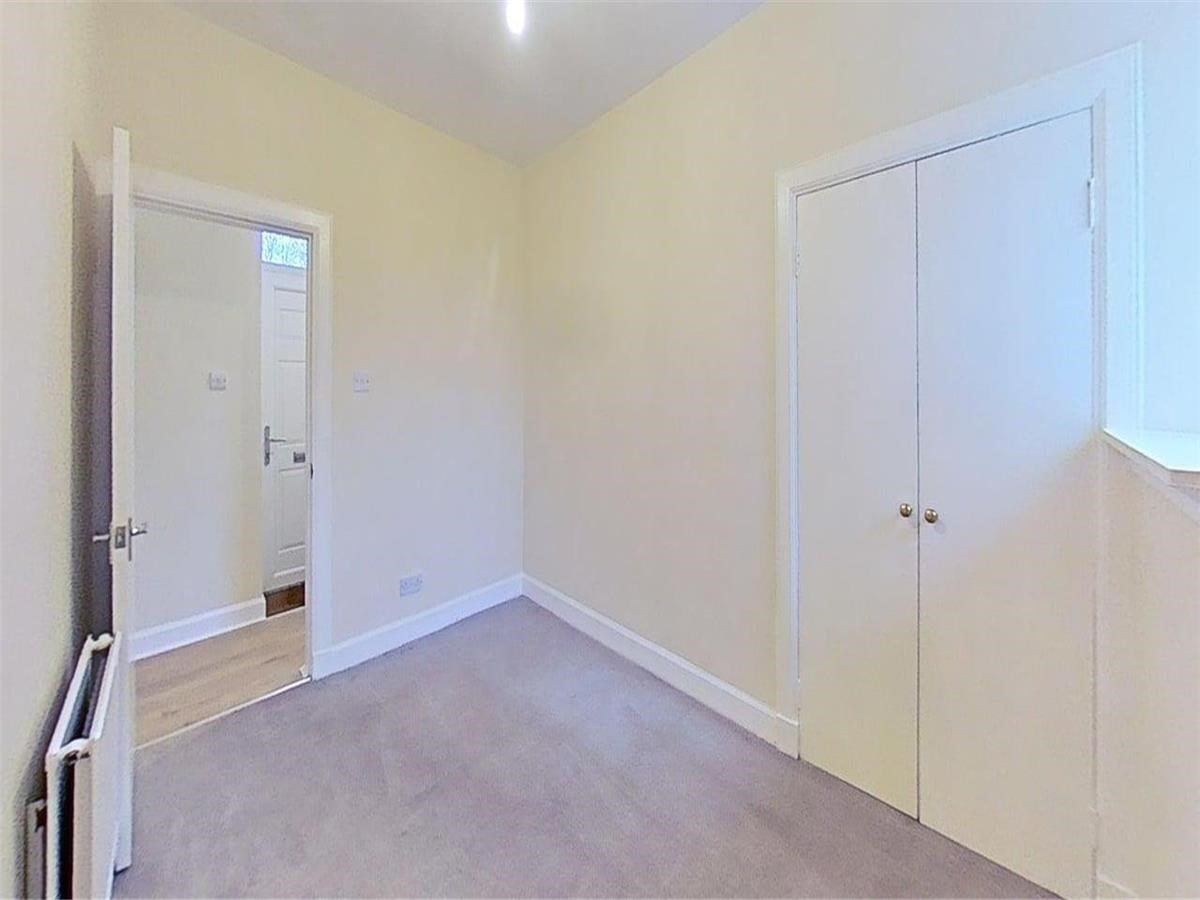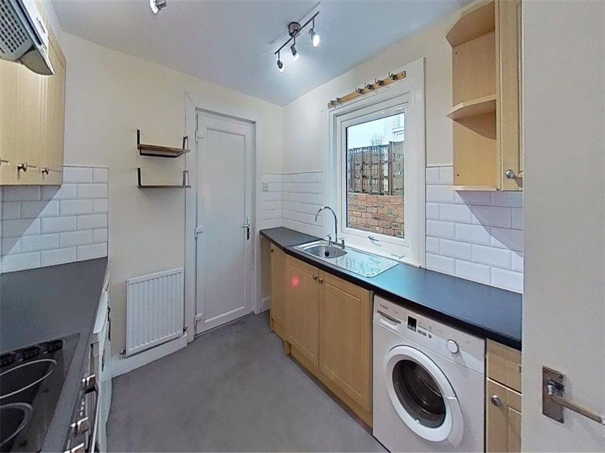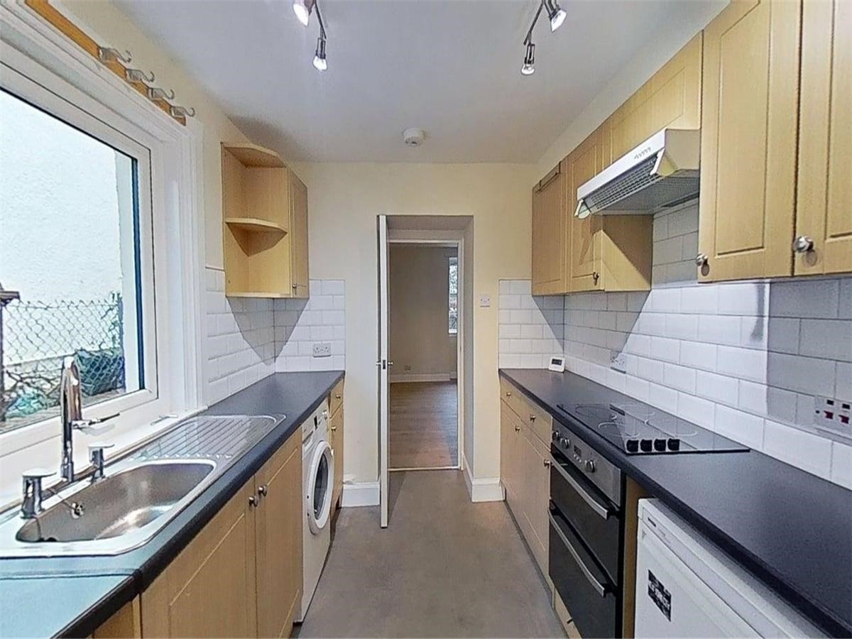 Offered unfurnished, the property features a bright, generously sized lounge with neutral decor and stylish wood-effect flooring, a theme carried throughout the home. The lounge leads to the first double bedroom and to the modern kitchen, fitted with shaker-style wall and base units, white brick-effect splashback tiles, and appliances including an electric oven, hob, washing machine, fridge, and freezer. From here, doors open to the private rear garden. The home further benefits from two additional double bedrooms, one with a large built-in storage cupboard, and a contemporary family bathroom featuring white brick-effect tiles, a vanity unit, and a heated towel rail.