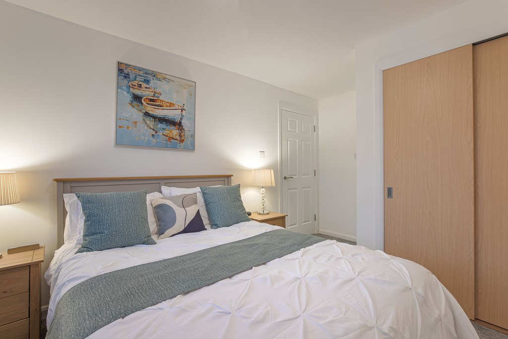 BEDROOM 1 This bedroom feels calm, cosy, and wonderfully restful. Thoughtful details like the built-in wardrobe and uncluttered layout keep the room feeling open. The large double bed in this room gives a cosy vibe and provides a comfortable retreat at the end of a busy day. This room also contains an en-suite bathroom complete with a modern design and spacious shower area.