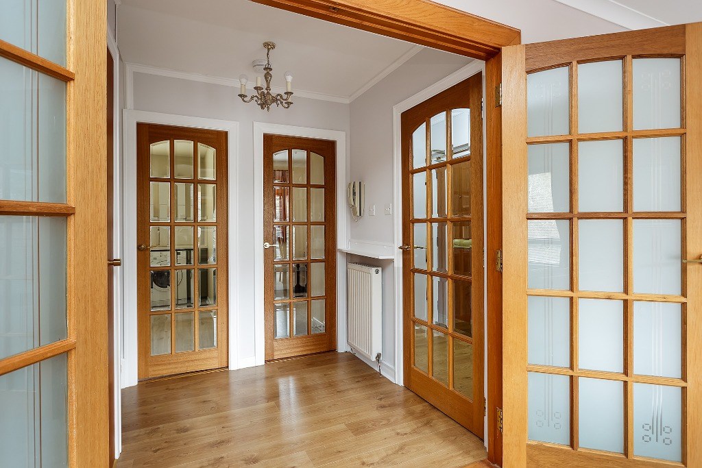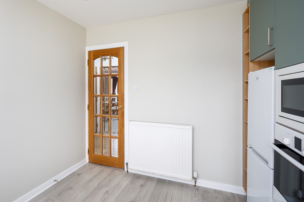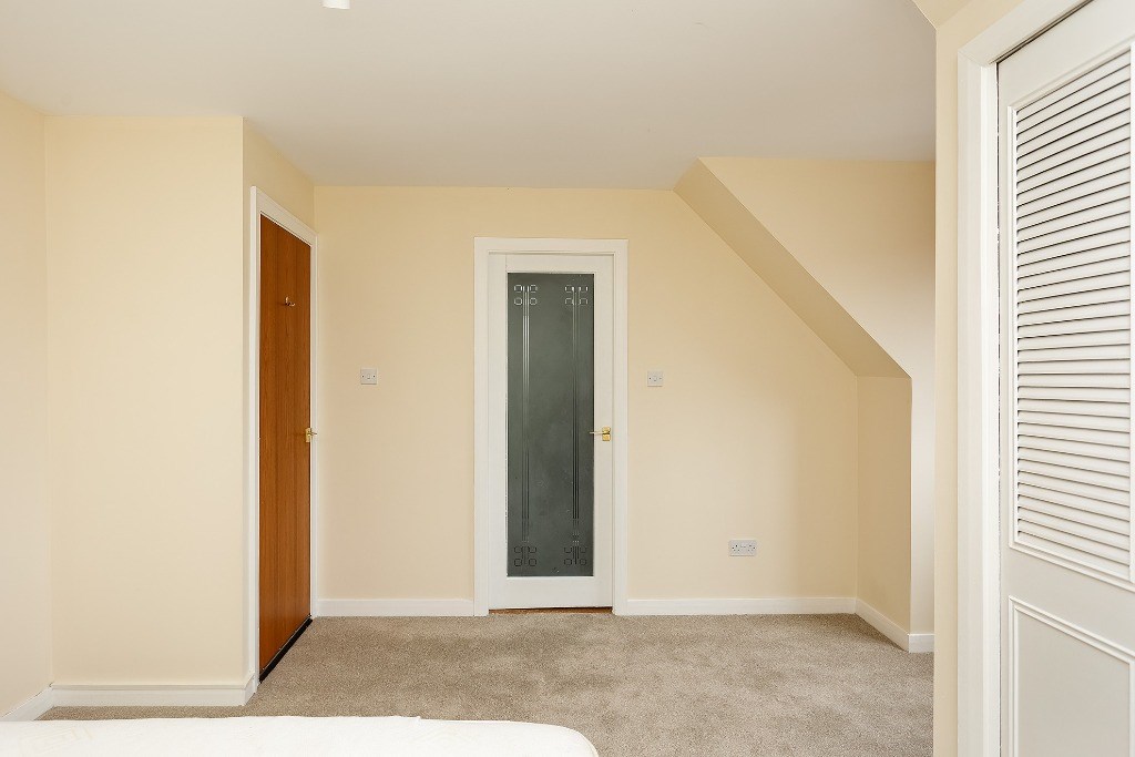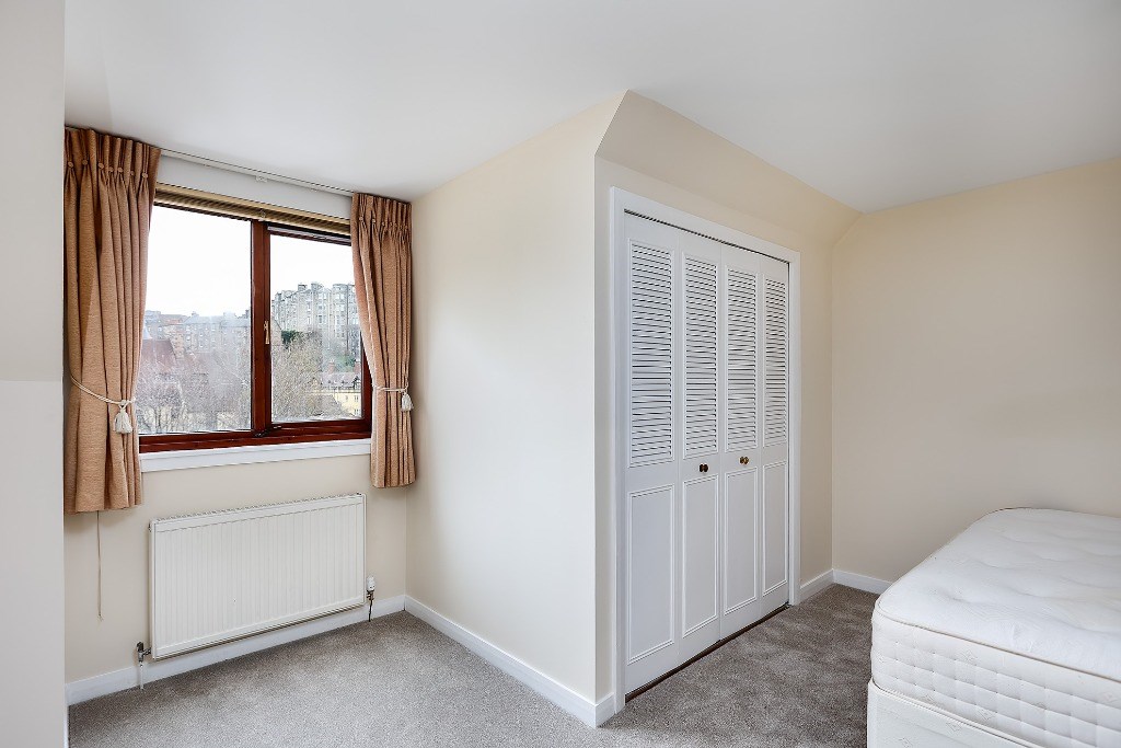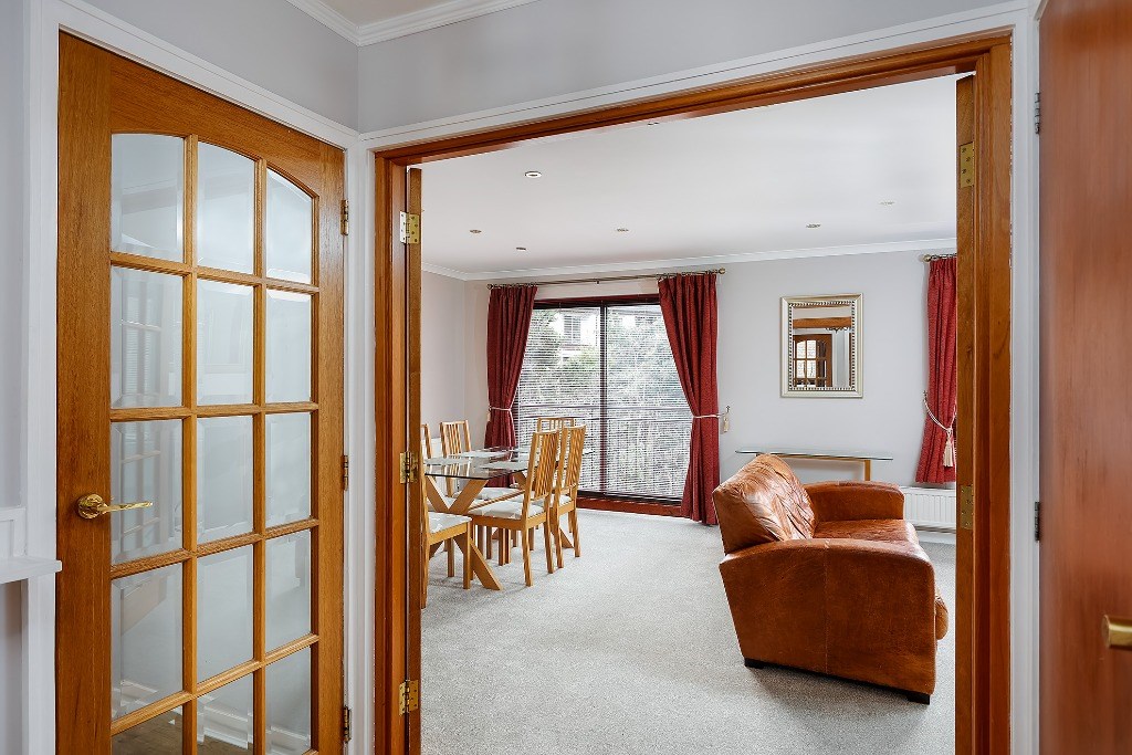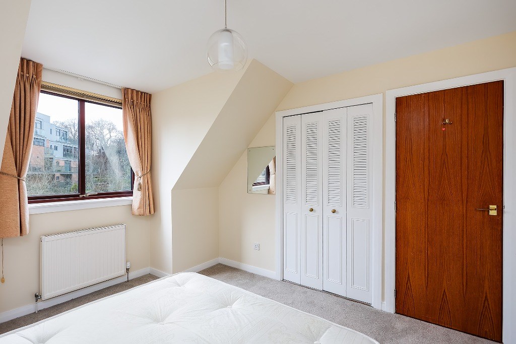 Internally, the property has been recently redecorated and upgraded throughout, including new flooring, a new bathroom, a new en-suite, and an upgraded kitchen. The accommodation comprises an entrance hall with two storage cupboards, a bright and generous living room with dining area and French doors leading to the balcony overlooking the Water of Leith, a modern kitchen with integrated appliances, and a flexible third bedroom or study. Upstairs, the master bedroom offers excellent storage and an en-suite shower room, alongside a second double bedroom with fitted wardrobes and a contemporary family bathroom with shower over bath. There is additional storage available in a shared external cupboard.